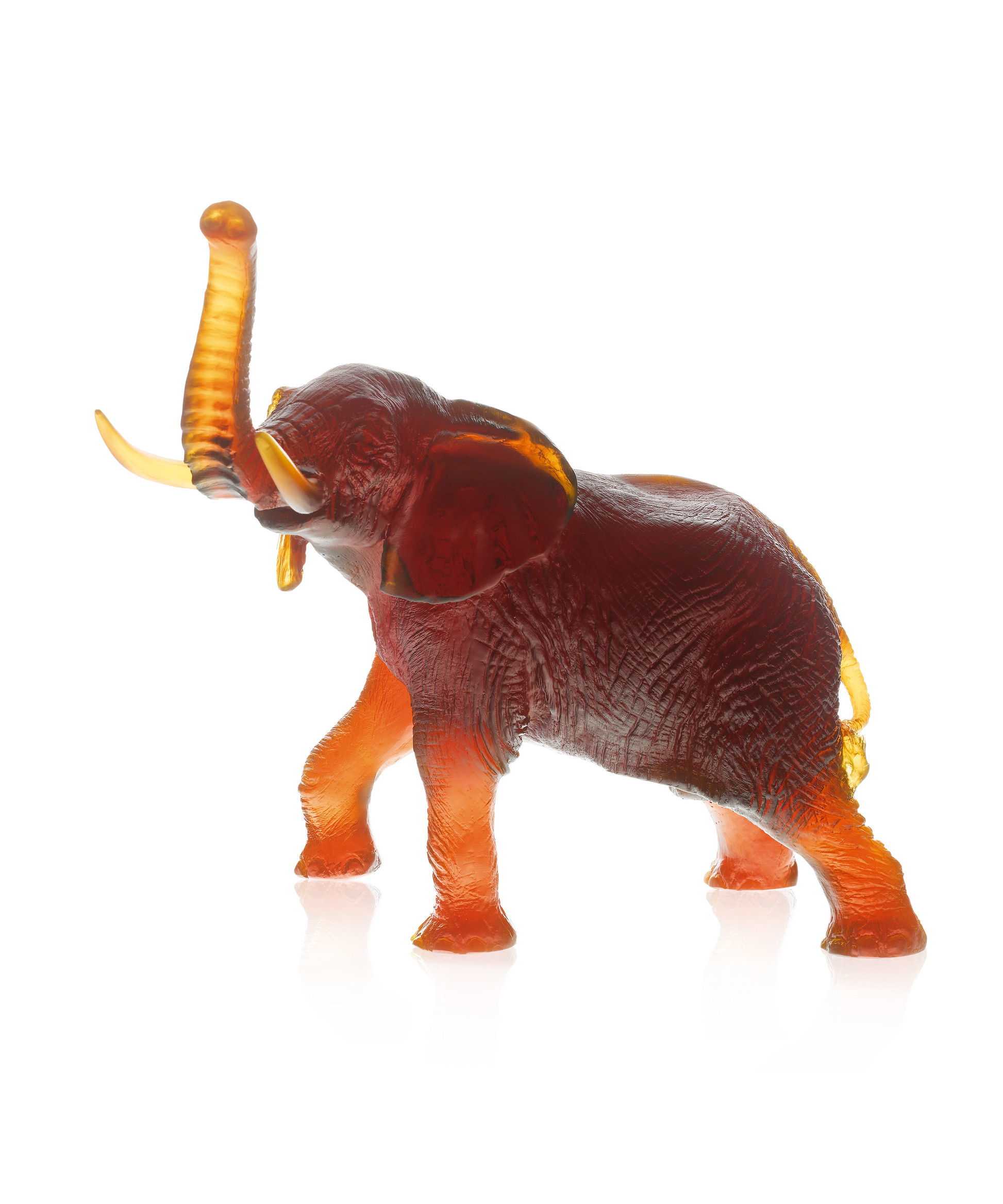 Evoking the quiet strength of an elephant in motion, this amber sculpture is a poetic celebration of nature. A work by the artist Jean-François Leroy, it is made of glass paste, a centuries-old technique cherished by the Daum house. The amber hues, alternately soft and intense, delicately capture the light to bring this majestic presence to life. The striking expression and eternal movement of the animal are captured in a living crystal, offering a subtle and refined interpretation of wild beauty. This imposing sculpture invites contemplation, creating an atmosphere that is both calming and inspiring.