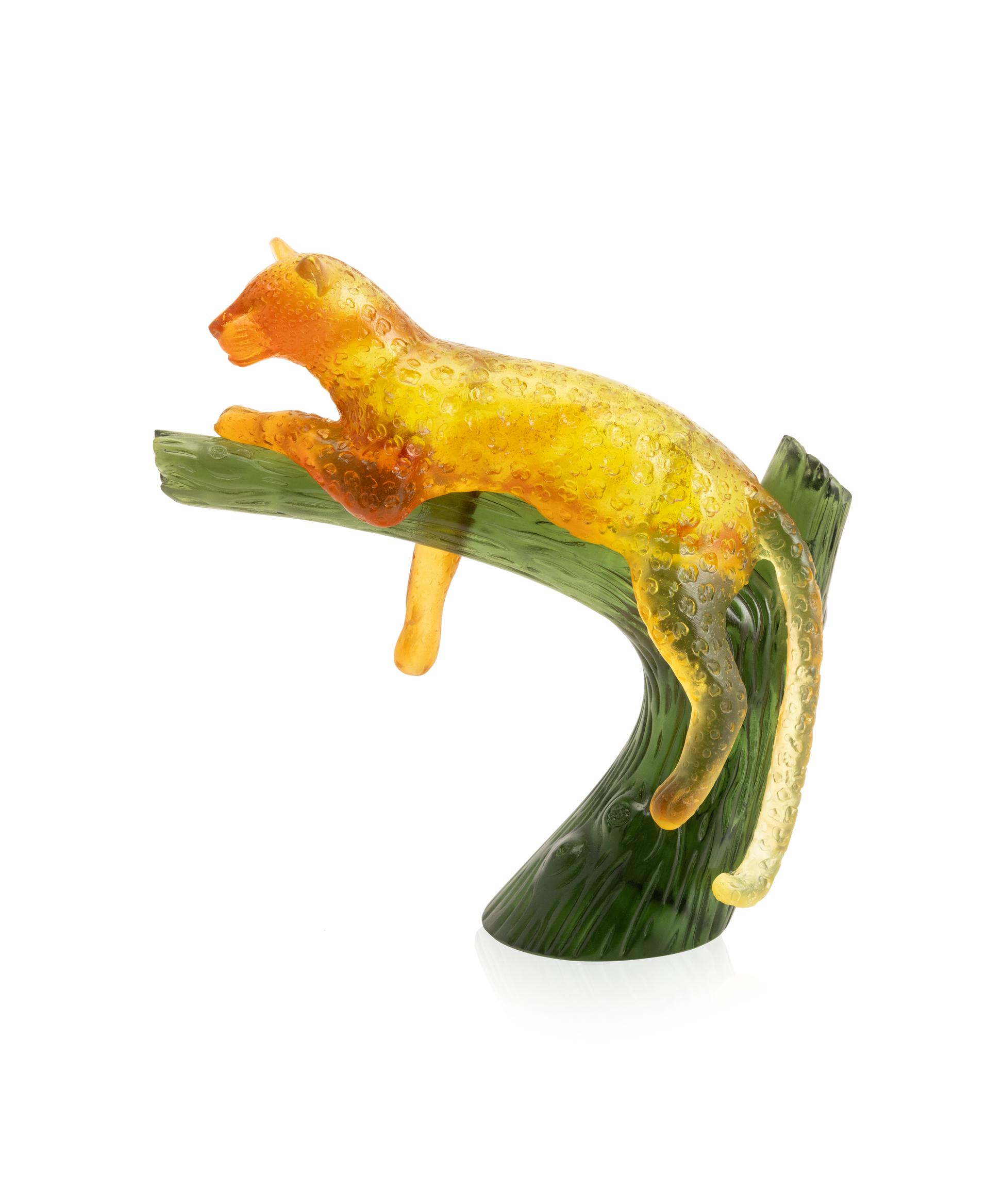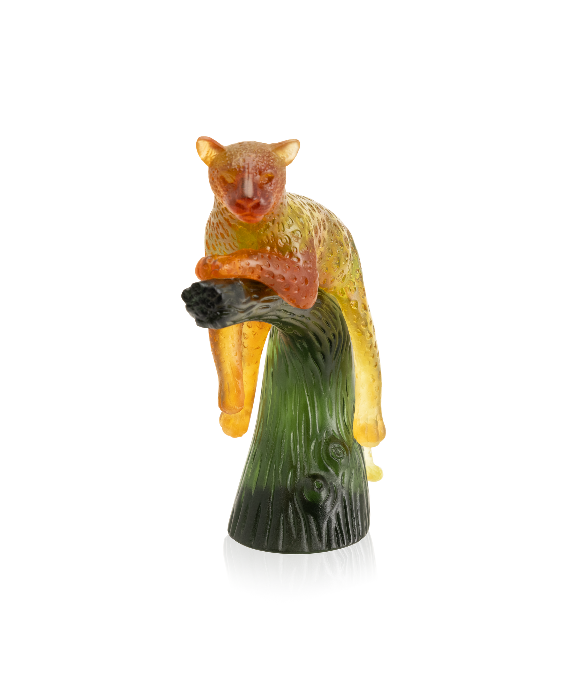Inspired by the wildness of the jungle, this crystal sculpture captures the grace and power of the panther. It is crafted with centuries-old artisanal mastery, combining glass paste with amber and green hues to evoke the animal in its natural habitat. The flashes of light that pass through the living crystal create a spectacle of changing colors, reflecting the different seasons. This piece exudes a magnetic presence, inviting contemplation of the beauty of nature captured in eternal movement.
