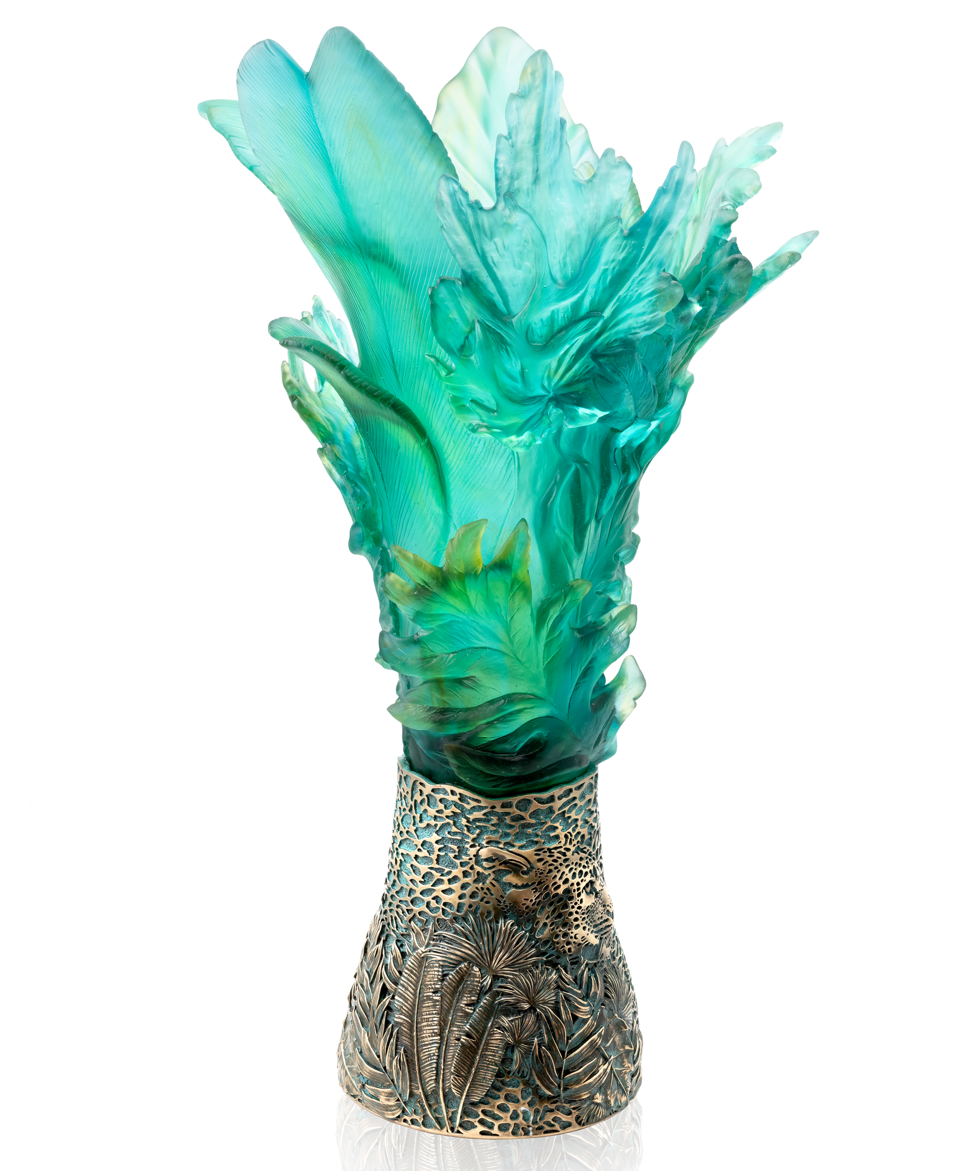 Inspired by the lush forests of Borneo, this Prestige Tropical vase embodies the vibrant breath of the wild. Made of pâte de verre crystal, its age-old technique magnifies the graceful curves of this art vase. The shades of green, similar to those of tropical foliage, play with the light and dance with the interplay of light and shadow. The slender neck and nuanced transparencies create a vibrant play of light, transforming each bouquet into a sublime composition. This vase, with its delicate yet imposing presence, invites contemplation and escape, like a window open to the exuberance of tropical nature.