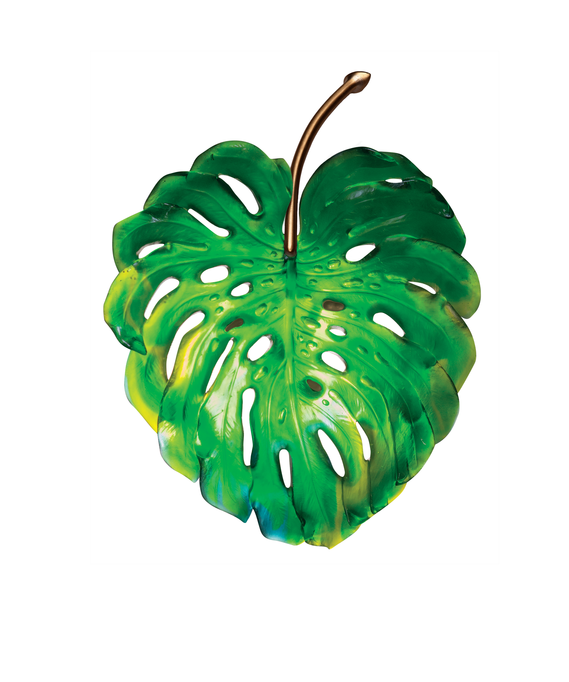 The Green Small Wall Lamp by Emilio Robba, from the Monstera collection, evokes transparency as a universal language. Made of glass paste, it reveals a symbol of timeless elegance and the pure beauty of crystal. Its play of light and transparency sublimates the harmony between light and material, creating a fascinating aura. Every detail testifies to exceptional craftsmanship and a passion for creation. A poetic and timeless work by Daum, where art and nature come together.