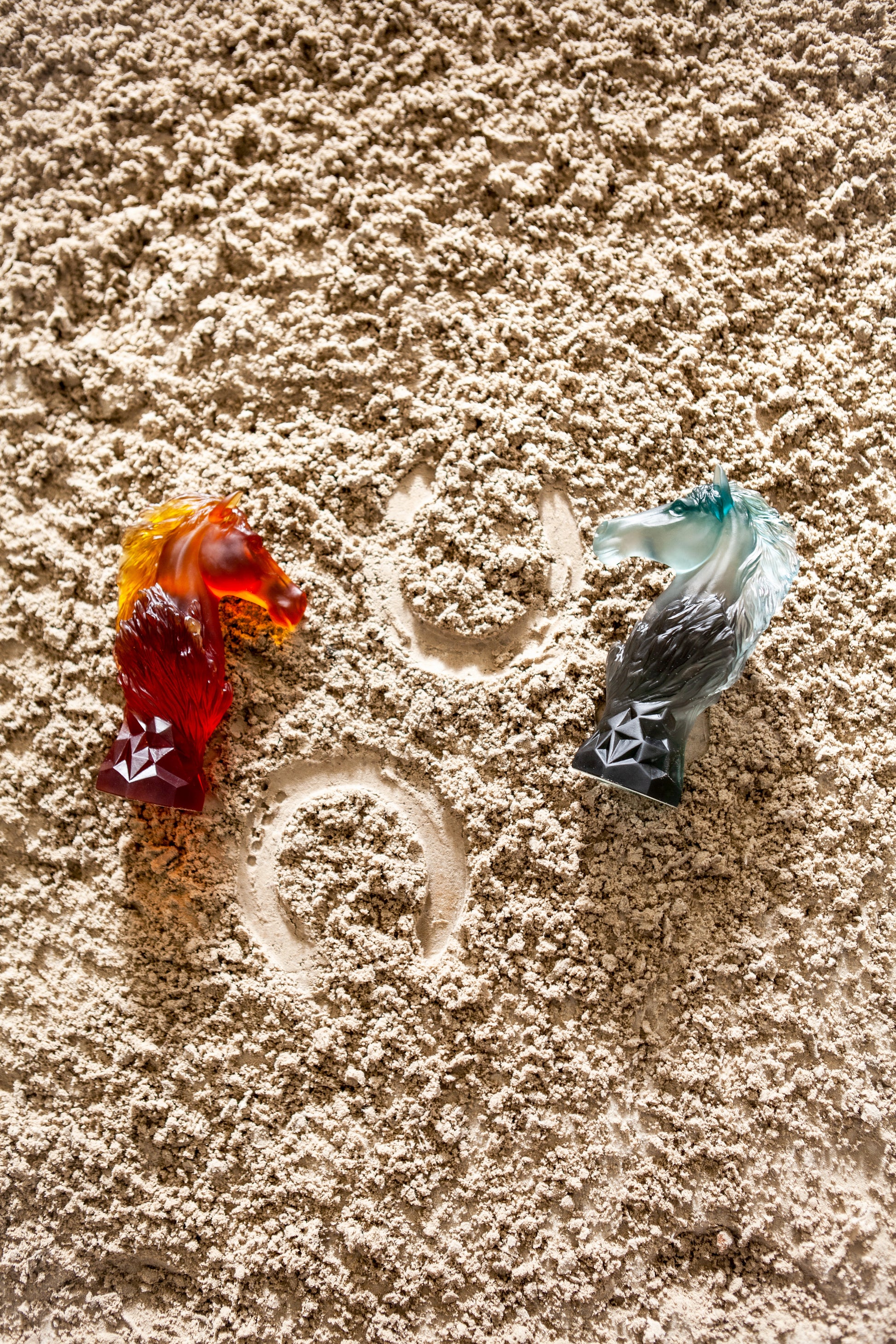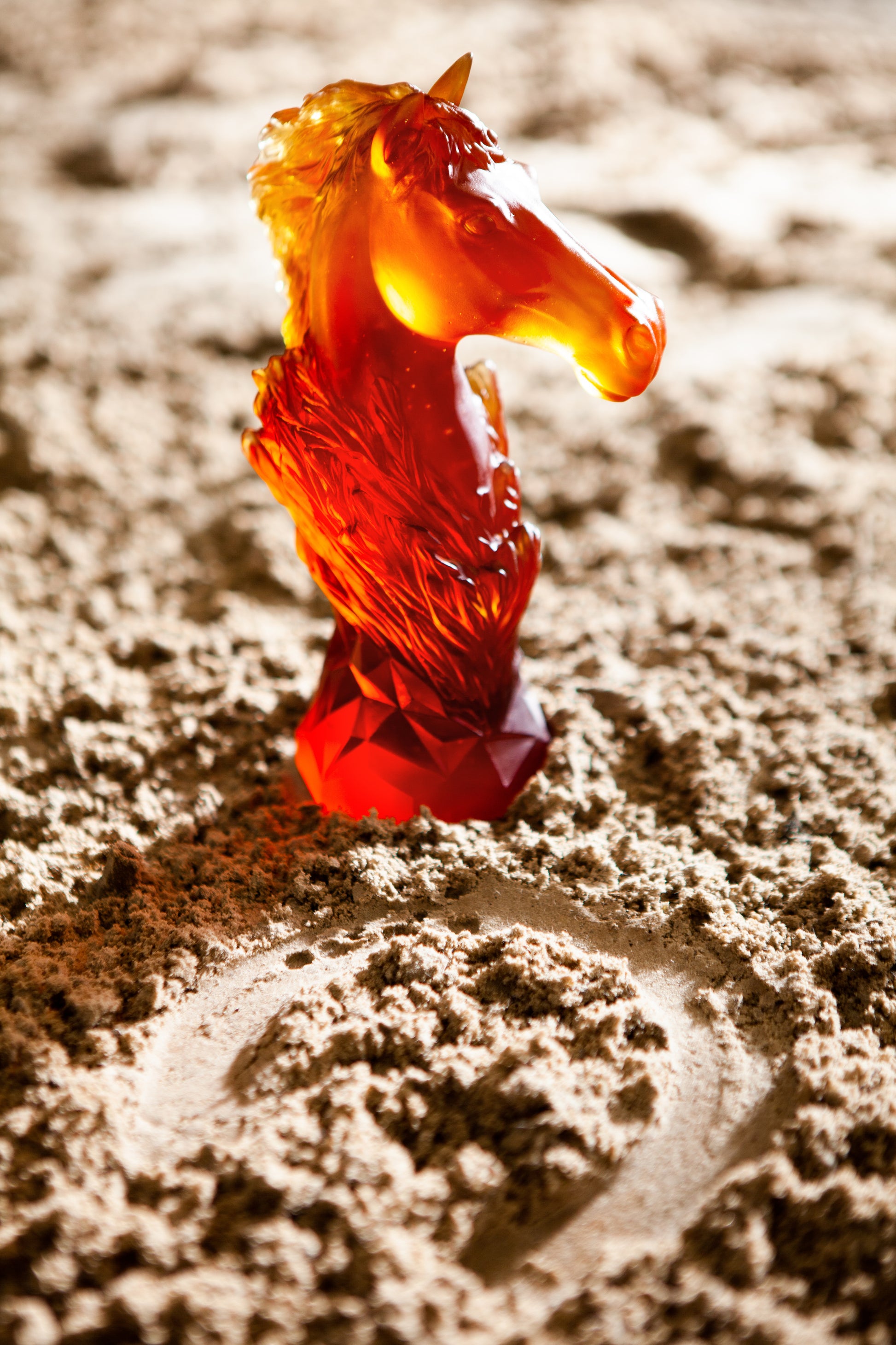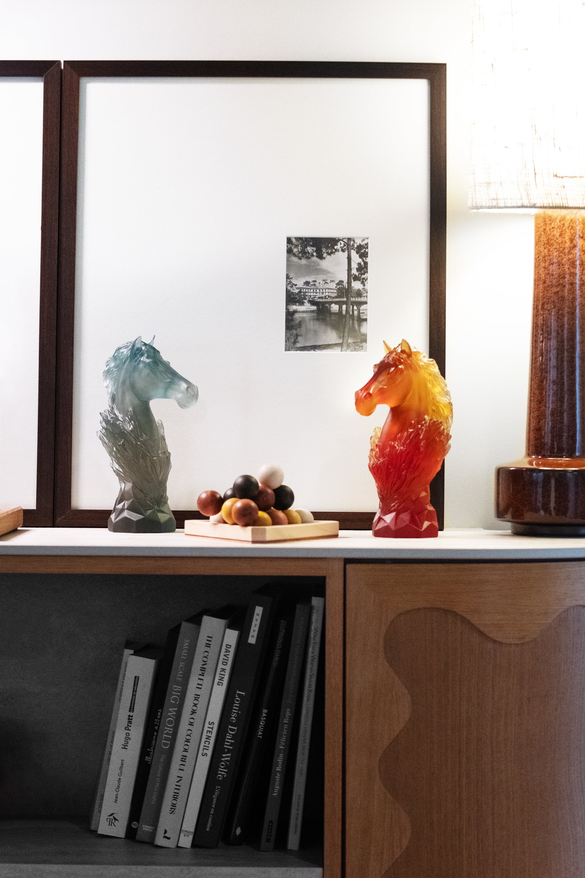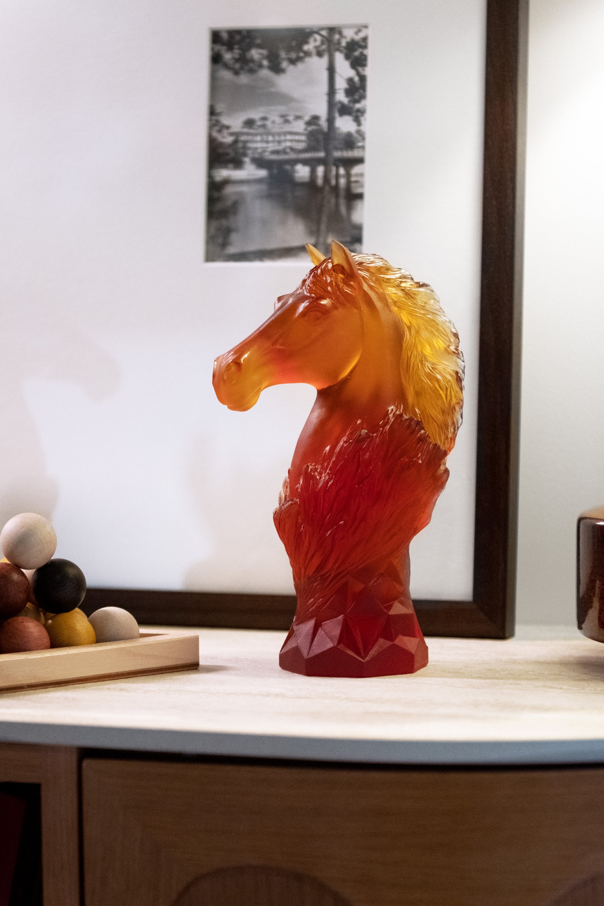 Inspired by the noble game of chess, Daum's Amber Horse evokes the eternal gallop of a horse. Made of pâte de verre, a centuries-old technique, this sculpture reveals unparalleled craftsmanship, creating an imposing presence. The nuances of the amber capture the light, adding a vibrant dimension to this work of art. This sculpture, with its striking expression and frozen movement, becomes a centerpiece that invites contemplation.