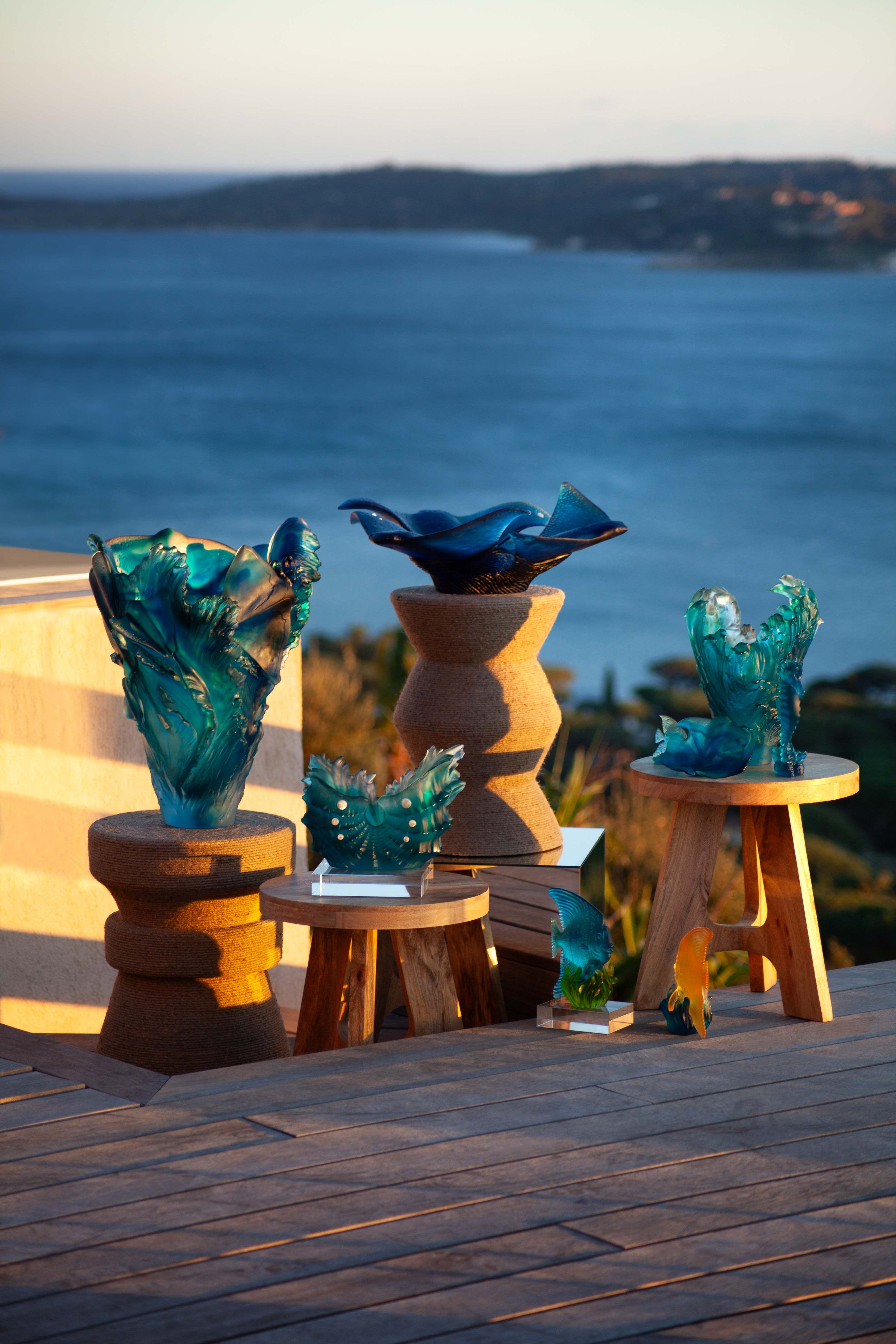 Beyond these monumental pieces, the Maya collection unfolds in a series of more intimate creations, equally remarkable for their finesse and expressiveness. The shell vase, adorned with delicate mother-of-pearl discs, evokes the gentleness of tropical shores. The round bowl, entirely sculpted with rays in motion, plays on the transparency and undulations of the crystal to convey the sensation of water. The seahorse, a refined creation in deep shades of turquoise blue, completes this series. Finally, a collection of batfish, colored in vibrant hues (solar yellow, lagoon blue, emerald green), completes the ensemble. Through Maya, the House of Daum perpetuates its heritage of marine inspiration, begun in the 1900s and successfully revisited over the decades. This collection celebrates the ocean, a source of life and infinite inspiration, by combining the ancestral technique of pâte de cristal with contemporary innovation. More than a collection, Maya is an invitation to travel: a plunge into a world where natural beauty becomes eternal thanks to the hand of man.