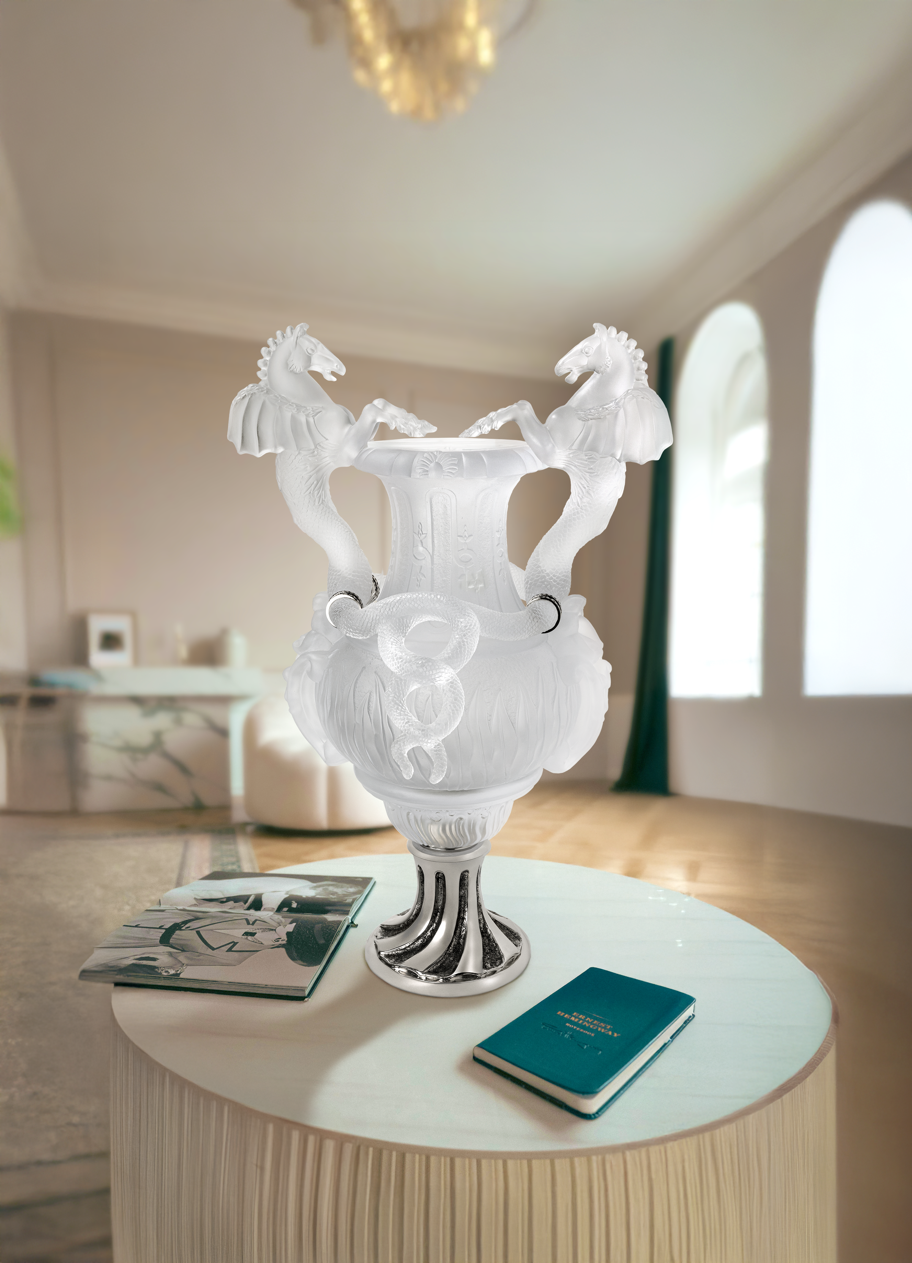 The vases and sculptures in this collection are distinguished by their fluid curves, slender silhouettes, and delicate nuances—from pure white to silvery grays and deeper tones. Natural light dances across their textured surfaces, creating shifting reflections that evoke the breath of the wind and the majestic sway of the winged horse. Every meticulously sculpted detail testifies to exceptional craftsmanship: the finesse of the wings, the elegance of the movement, the nobility of the posture. Whether displayed alone or enhanced by a bouquet, each vase becomes a true living tableau, bringing elegance, dynamism, and a poetic aura to any interior. The Winged Horses collection embodies the perfect union of nature, myth, and glass art—an invitation to contemplation and a tribute to the timeless beauty of living crystal.