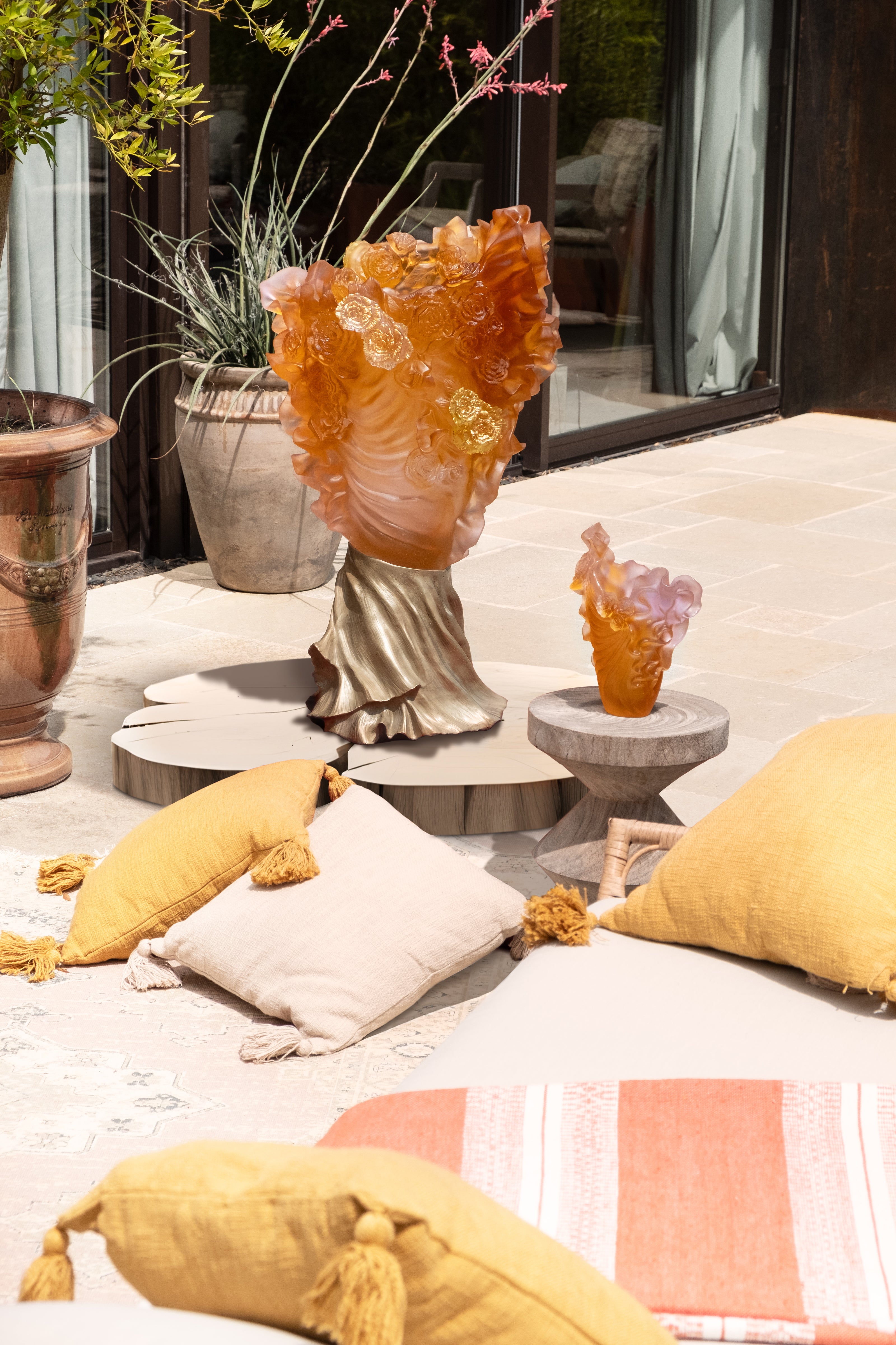 The vase has been the flagship product of the Daum crystal works since its founding in 1878. The centerpiece of the Rose Royale collection is none other than the prestige Rose Royale vase, produced in a limited edition of 50. This extremely rare model stands nearly one meter tall, weighs over 75 kg, and is made of crystal and bronze, resting on a base with a satin varnish patina. This piece required over 900 hours of work and features 35 finely sculpted roses in shimmering hues, their petals blending into an elegant crystalline drape, extended by the delicate curve of the base. Subtle touches of gold leaf illuminate some of the flowers, enhancing their brilliance. The Rose Royale line distinguishes itself from other rose collections through its warm colors—pink, orange, and yellow—as well as the shapes of its petals. Indeed, while the flowers in the Rose Passion and Rose Éternelle lines faithfully reproduce the details of each corolla, those in Rose Royale seem perpetually in motion, as if enveloped in precious silk. Each bowl, each vase, appears draped in a sublime fabric, adorned with roses in refined and luminous hues. The Rose Royale collection is elegantly available in a large vase and a medium vase, perfect shapes for creating exceptional bouquets. A decorative flower and a centerpiece complete this floral collection, adding a delicate touch to the whole. Designed to illuminate their surroundings, the creations in this line shine with their creativity, extraordinary craftsmanship, and timeless charm.