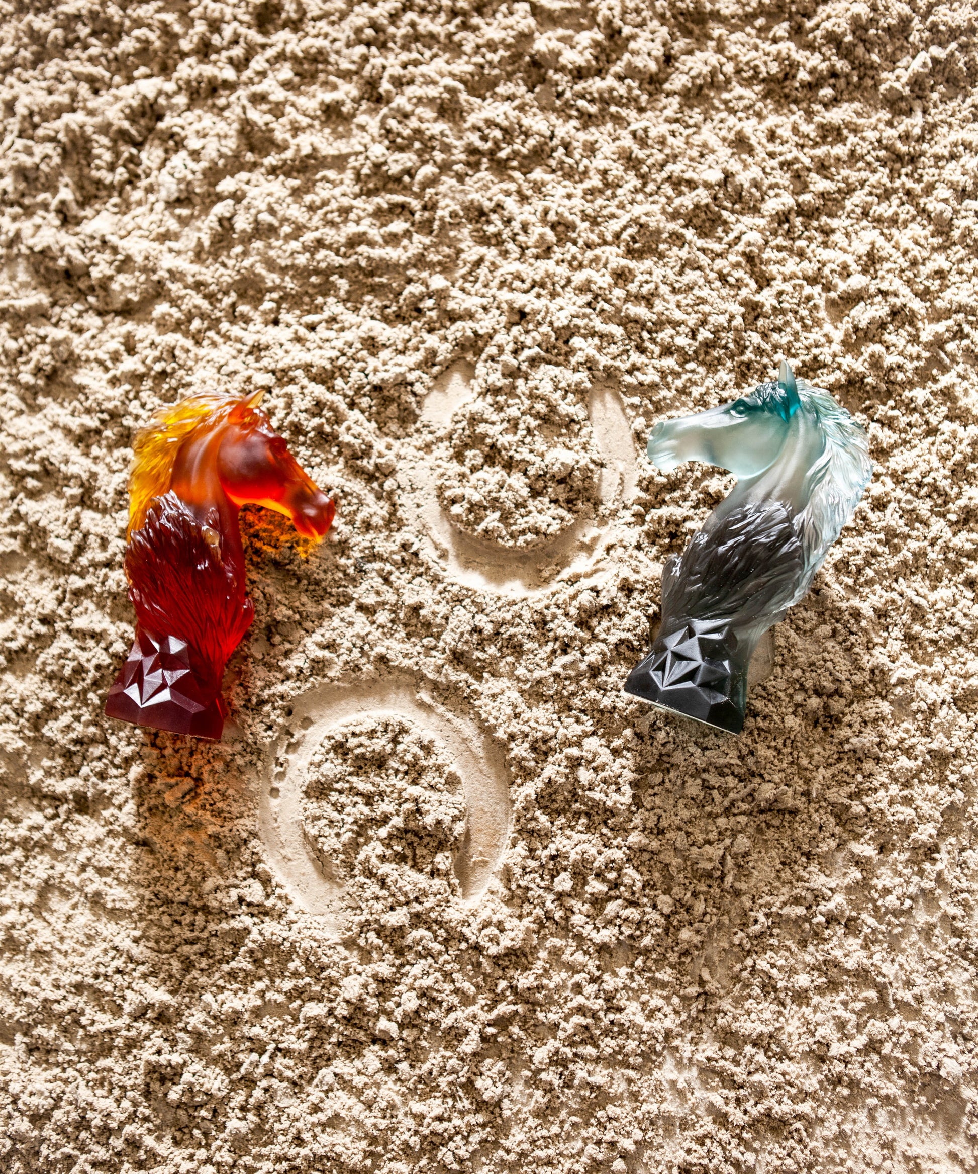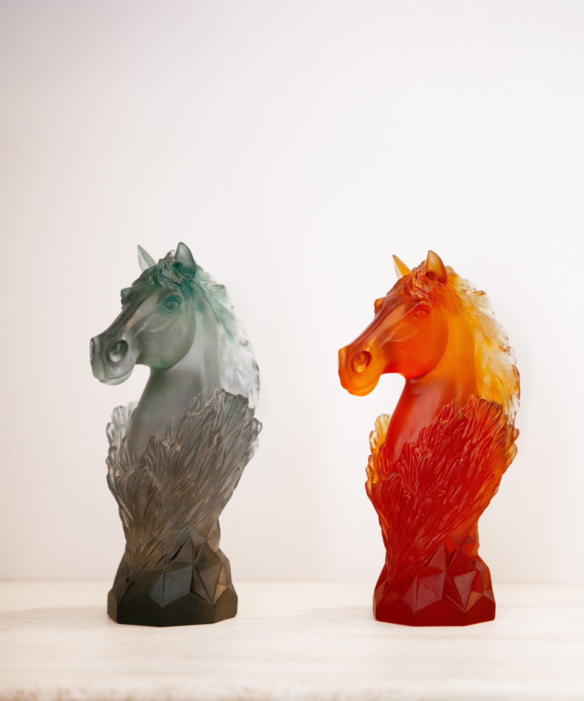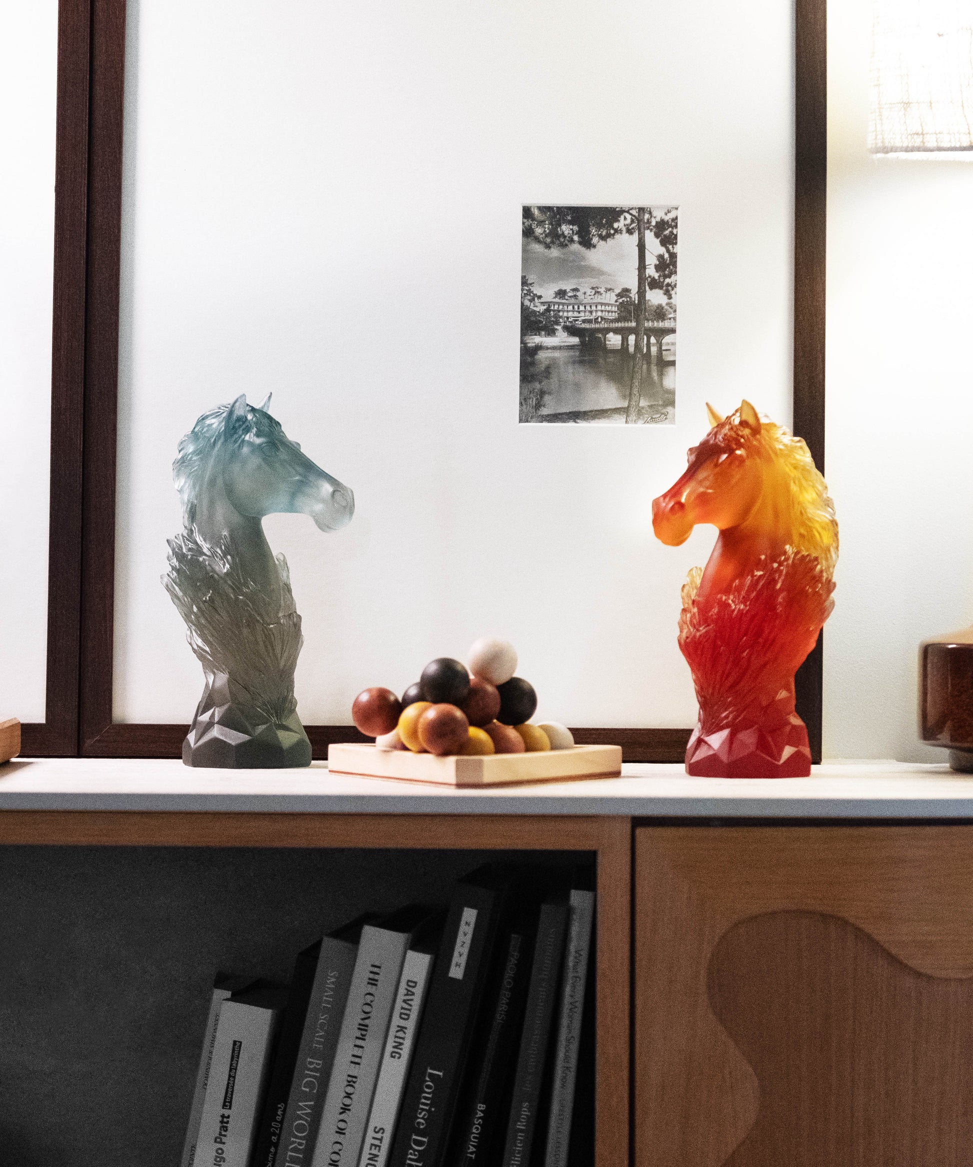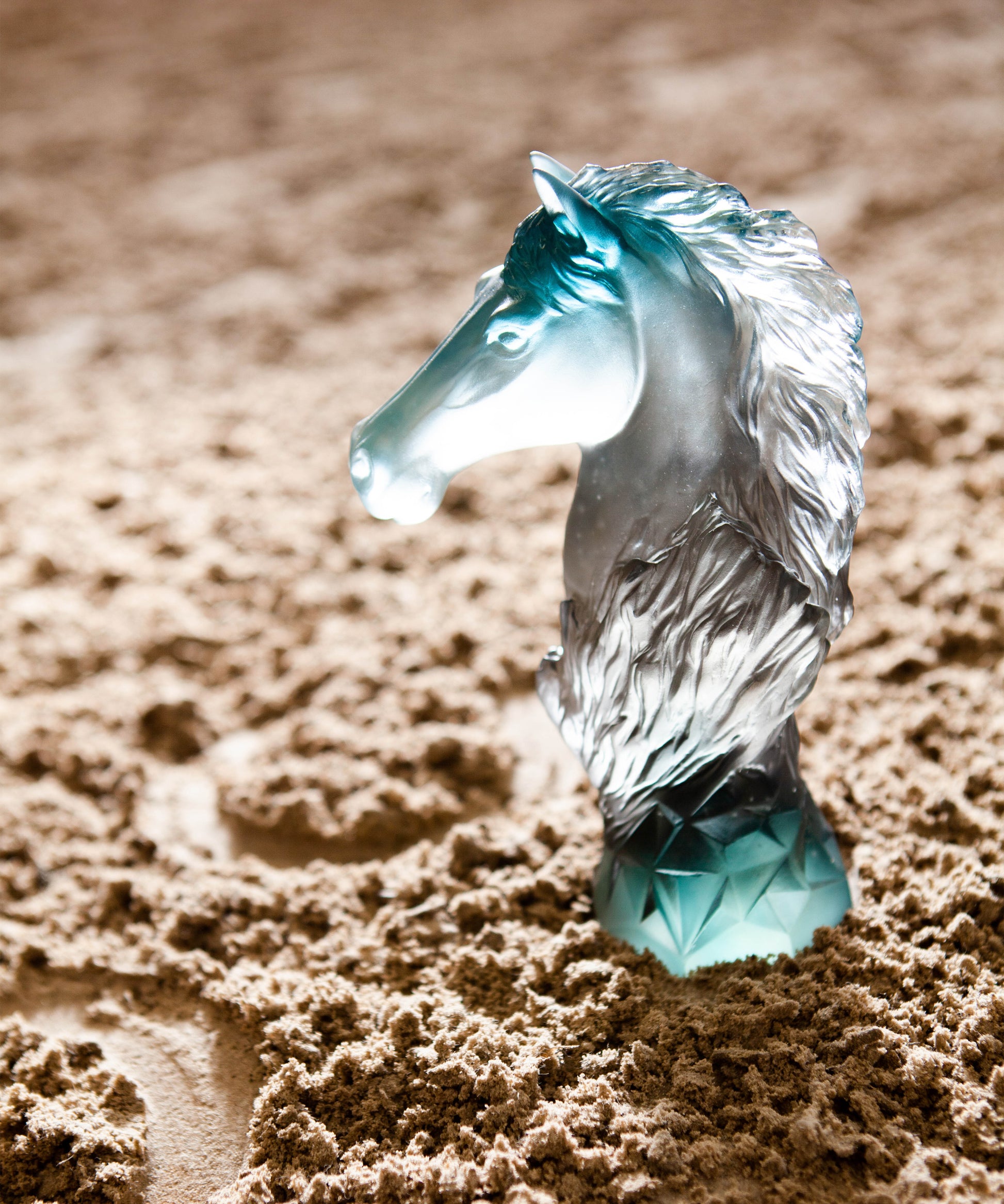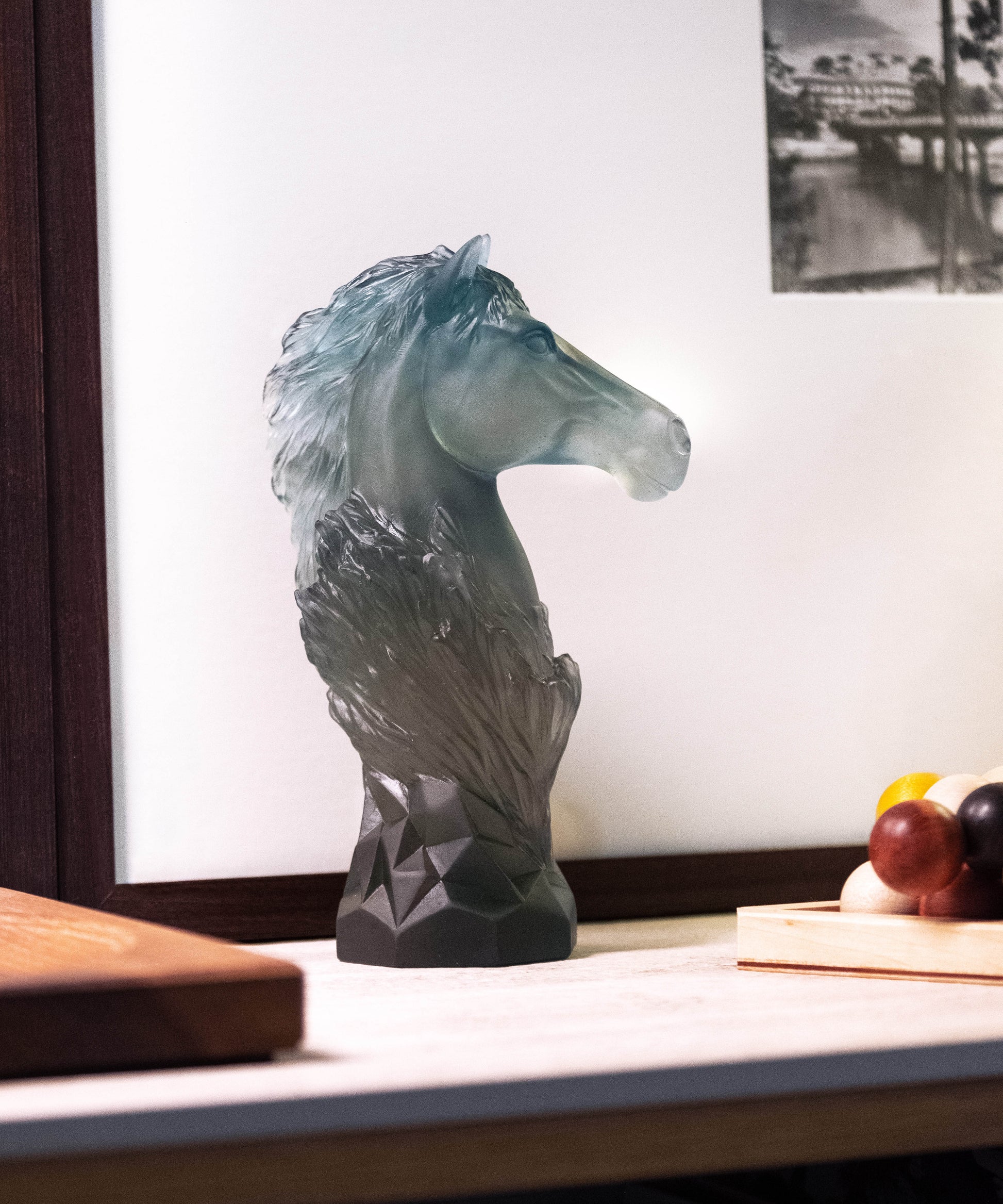 Poetically evoking the wild elegance of a horse in motion, this sculpture captivates with its powerful expression. Crafted in colored crystal using the age-old pâte de verre technique, it unfolds shades of blue and grey, beautifully capturing the brilliance of natural light. Every detail of this work reflects the artisanal expertise of Maison Daum, making the living aspect of the crystal palpable. Commanding and magnetic, the 'Blue-Grey Chess Knight' invites a sensory journey, transforming every contemplation into a unique experience.