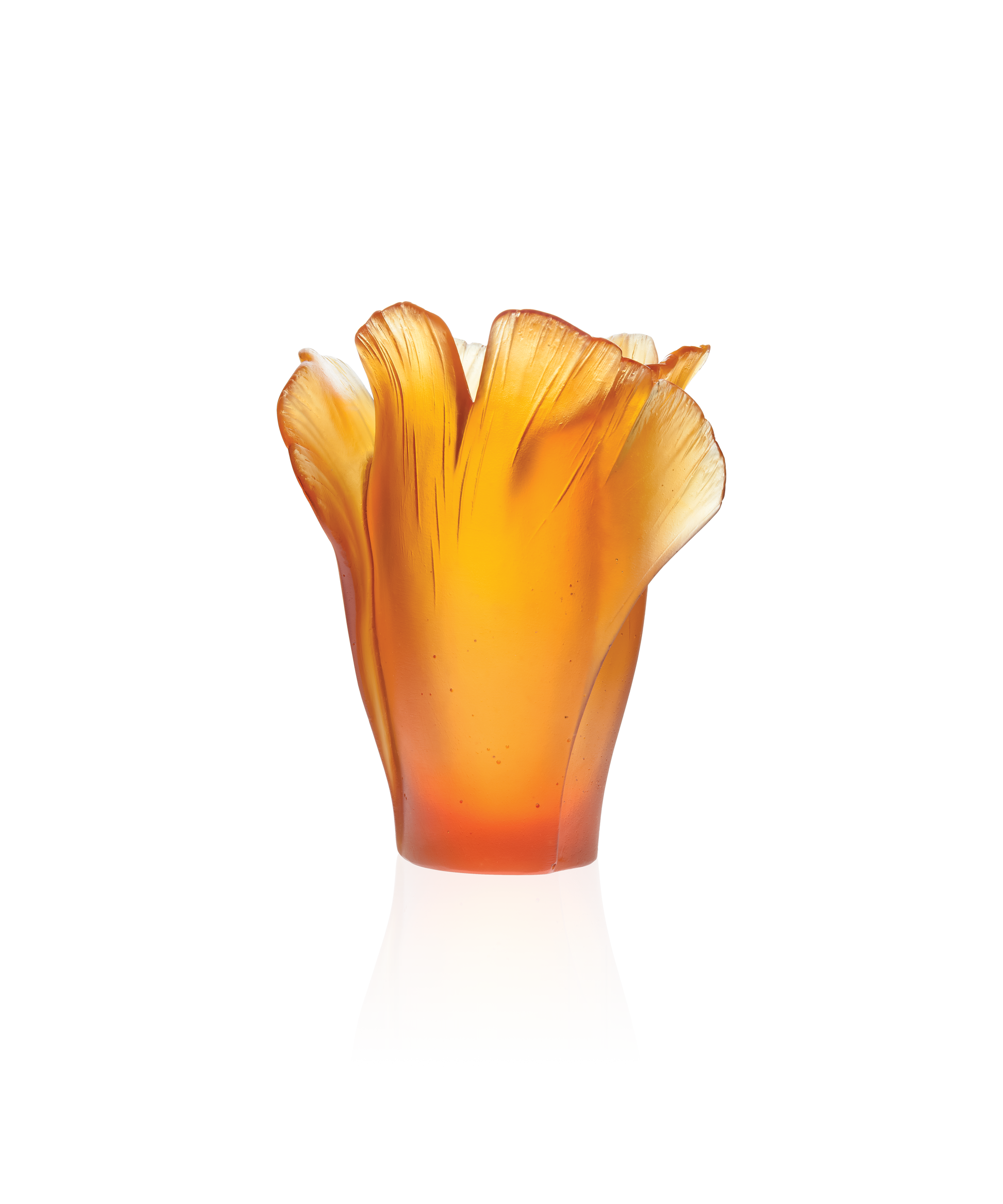 Inspired by the swaying leaves of the Ginkgo tree, this crystal vase evokes autumn and its warm hues. Made using pâte de verre, a centuries-old technique, it is distinguished by its amber color, nuanced transparencies, and the fluidity of its forms. The graceful curves of this vase and its slender neck capture the light, creating bursts of vibrant light that dance and shift with every perspective. Whether filled with flowers or left empty, this Daum vase adds a touch of refinement and beauty to any space, inviting contemplation and appreciation of the craftsmanship.