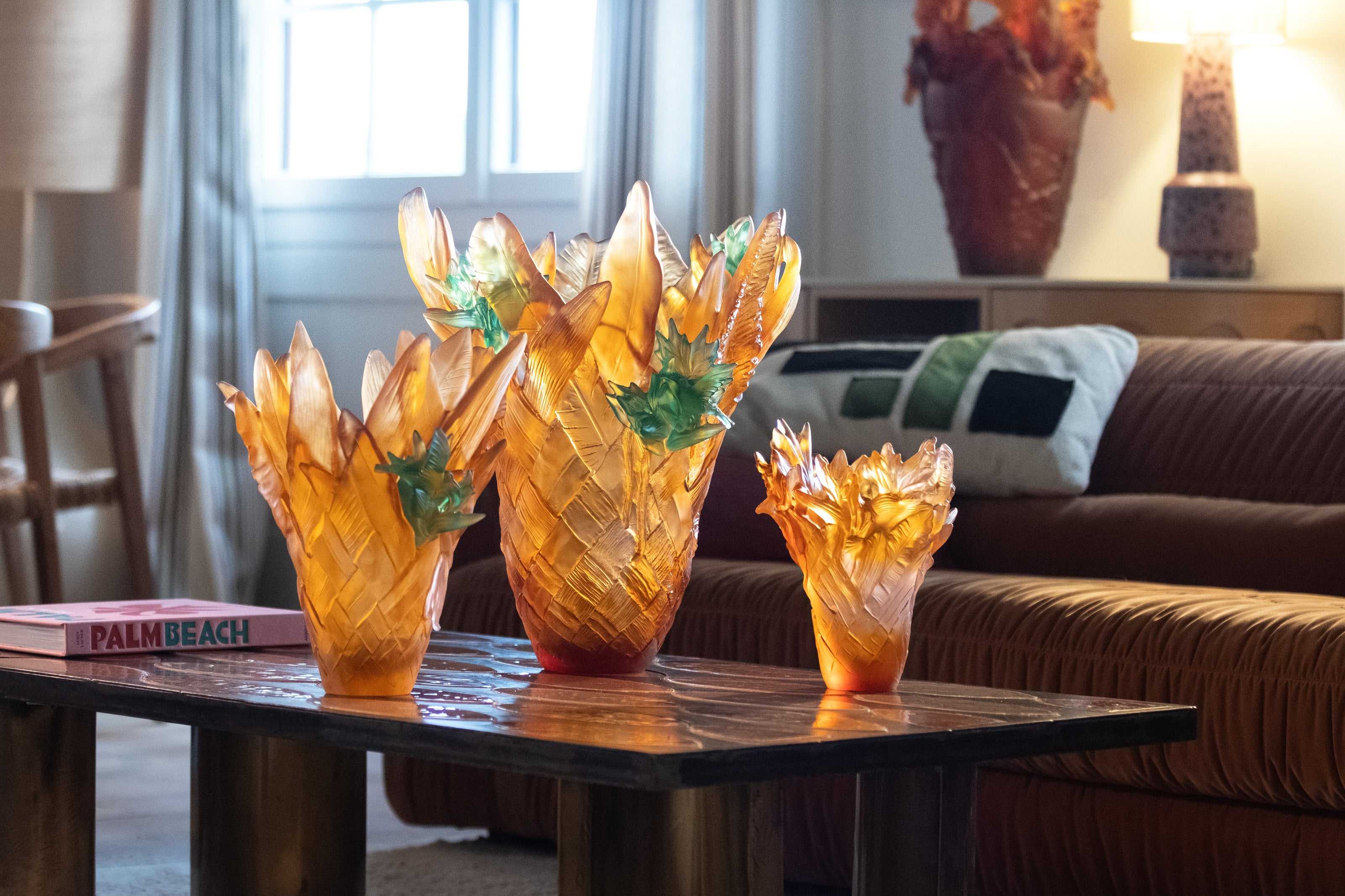 The creations in this new collection transport the art of crystal to a sunnier realm, where colors represent a lush and vibrant nature. Amber hues evoke the warmth of the island sun, while deep greens with emerald reflections recall the freshness of tropical foliage. In this chromatic symphony, light flows freely through the material, revealing its transparencies, shadows, and ever-changing brilliance. The pâte de cristal technique, which is the hallmark of Cristallerie Daum, captures both the density of plants and the lightness of woven materials. The crystal surface reproduces the refinement of natural fibers hand-braided by the time-honored techniques of traditional artisans. Each relief comes alive in the light, creating an impression of continuous movement. In this collection, crystal is not merely a sculpted material: it becomes an invitation to enter a verdant paradise shaped by the hands of the Cristallerie's artisans and enhanced by the imagination. The presence of hummingbirds, delicately integrated into the composition, completes this poetic vision. Sculpted from translucent crystal with emerald green hues, they seem suspended in flight, as if frozen in an eternal dance. Symbols of grace and agility, these birds add an ethereal dimension to the works, contrasting with the density of the plant forms. They embody movement within stillness, the vibration of life captured in an eternal material.
