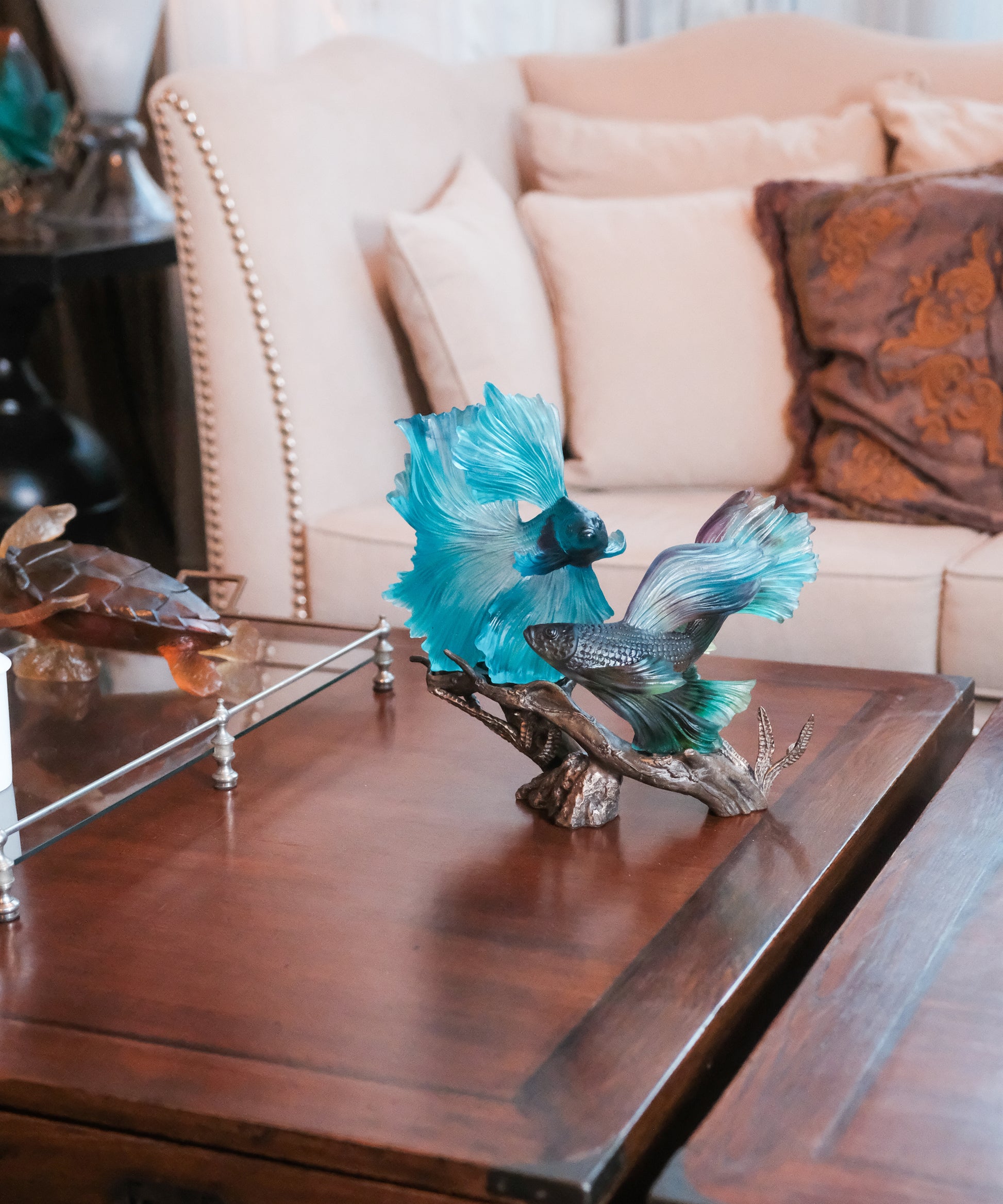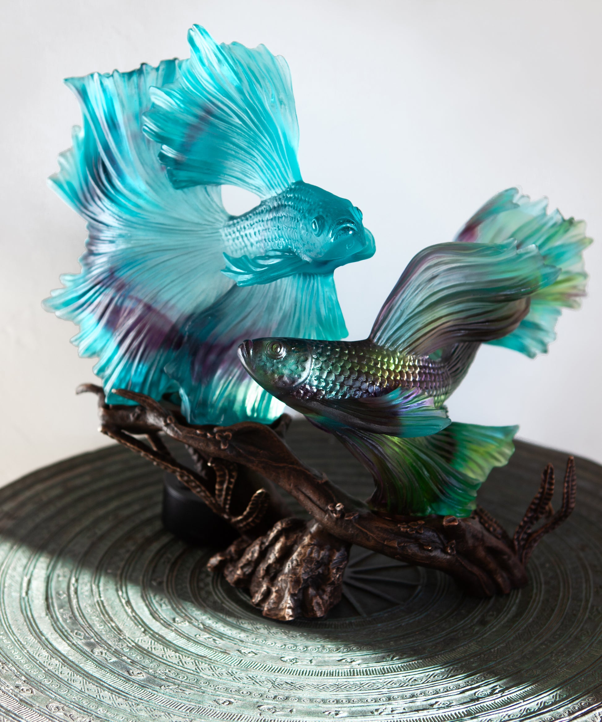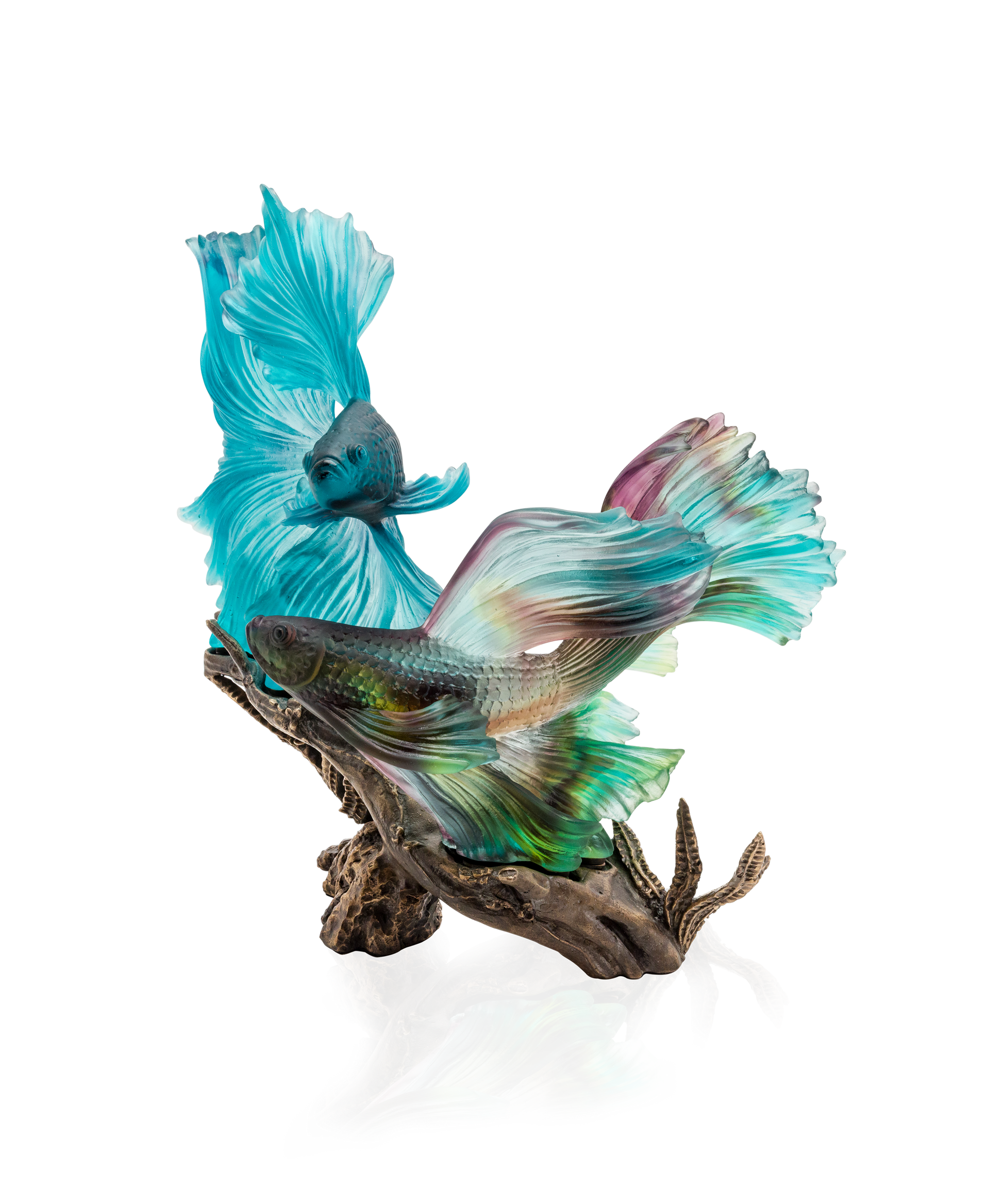 Evoking the mysterious beauty of the ocean depths, 'The Dance of the Coral Sea Fighters' captures the energy and elegance of fighting fish. Crafted with artisanal mastery, this glass sculpture reveals subtle nuances, blending colorful transparencies and shimmering light, creating a captivating visual spectacle. Imposing yet delicate, this artwork brings a magnetic presence to your space, inviting contemplation and illuminating the room with its maritime grace.