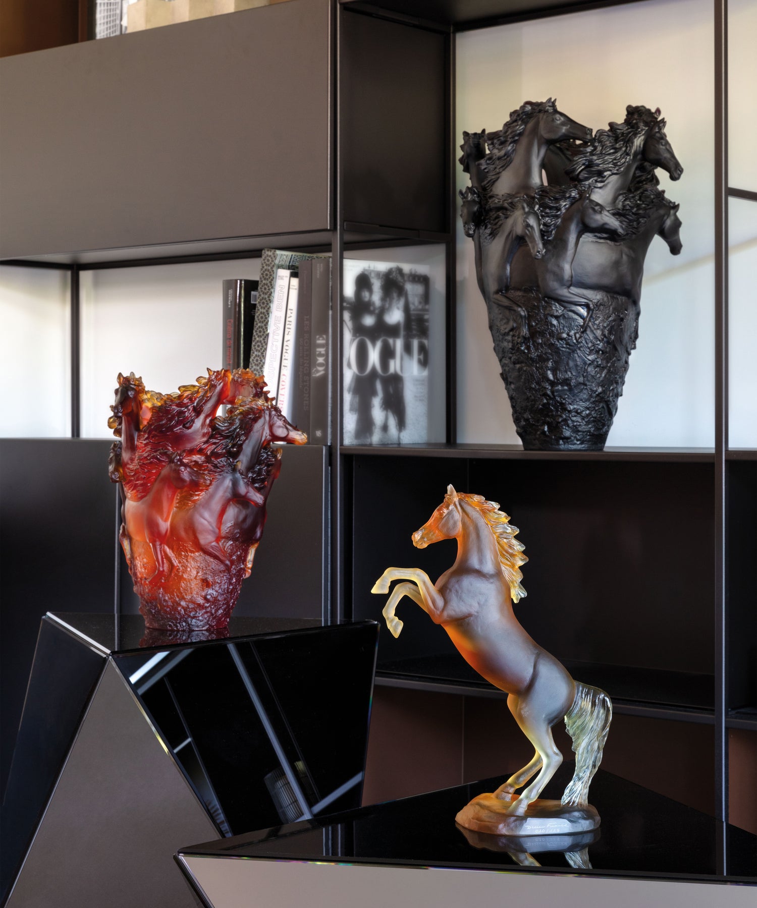 Crafted by master artisans, the works play with light through colored transparencies and shades of amber, brown, or clear crystal, giving the impression that the material itself comes alive. Every detail—the flowing mane, the elegant gait, the powerful movement of the body—testifies to centuries of expertise and striking precision. These imposing sculptures exude a magnetic and dynamic presence, capturing a moment of pure freedom. They infuse each space with a breath of energy, poetry, and eternal motion, inviting the eye to follow the animal's endless journey.