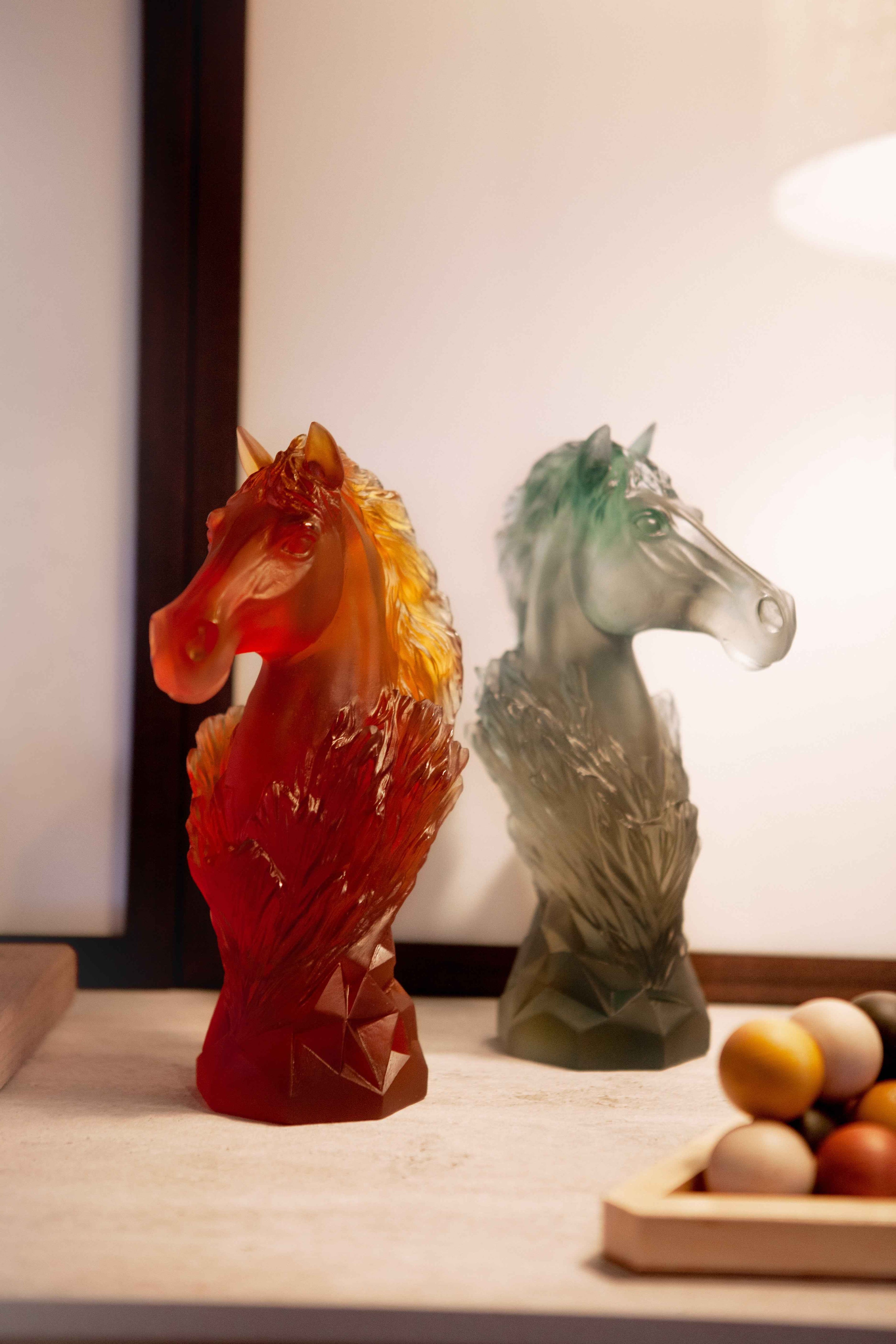 Powerful or delicate, Daum's animal sculptures express the meeting of the rigor of modeling and the fluidity of color. The crystal glass perfectly captures veins, coats, and plumage with an almost organic precision, bringing to life forms traversed by moving reflections. In the equestrian collection, the "Fierce Horse" and the "Cavalcade" capture the speed and energy of the gallop, their nervous lines seeming to surge out of the material. The "Florida Panther ," a deep amber, imposes its feline power in a tense posture, ideal for adorning a contemporary console. With the "Savana Elephant ," the amber and golden tones evoke the warmth of the African lands, bringing an atmosphere of travel and majesty to a living room.
