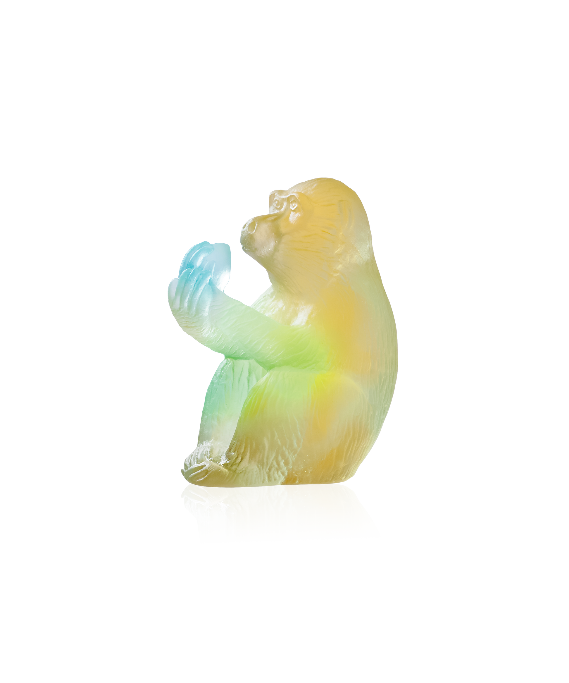 Inspired by the Chinese zodiac, this monkey sculpture evokes a scene of daily life in the tropical jungle. Masterfully crafted in pâte de verre, a centuries-old technique, the piece is distinguished by its blend of yellow and green colors, capturing the highlights of natural light. The monkey, clutching a peach, symbolizes curiosity and agility, and reveals a delicacy in the details. This Daum creation, both delicate and expressive, brings a touch of originality and elegance to your interior, inviting contemplation and daydreaming.