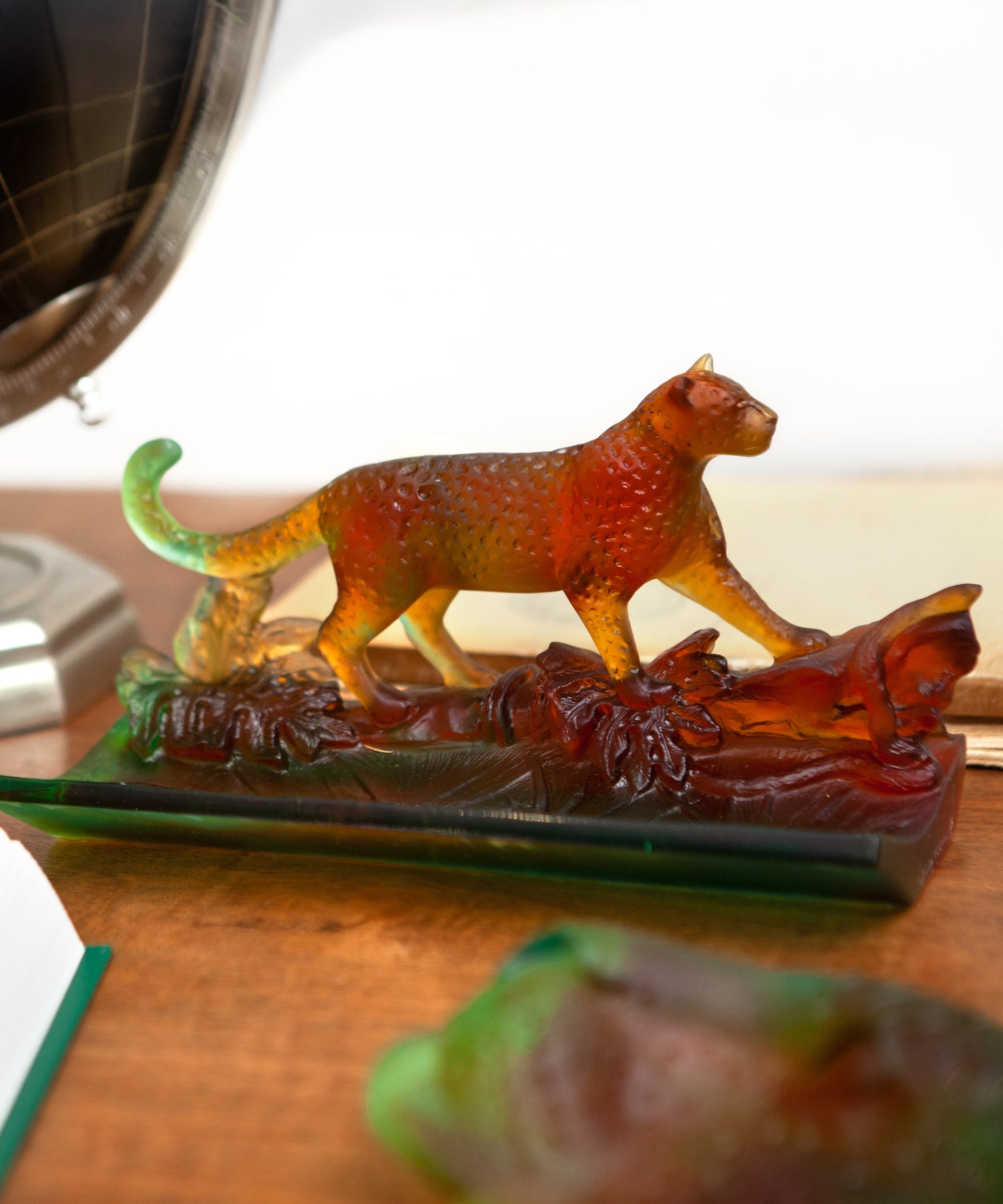 The collection includes sculptures, a pen case, a trinket tray, and decorative pieces, all enhanced by plays of light and transparency that highlight the nobility of movement. The meticulously crafted details tense muscles, fluid curves, iridescent reflections reflect the passion and excellence of the Daum workshops. Both poetic and timeless, these works invite contemplation of untamed beauty, eternally captured in crystal. Tropical Leopard embodies the perfect union of untamed nature and exceptional glassmaking.
