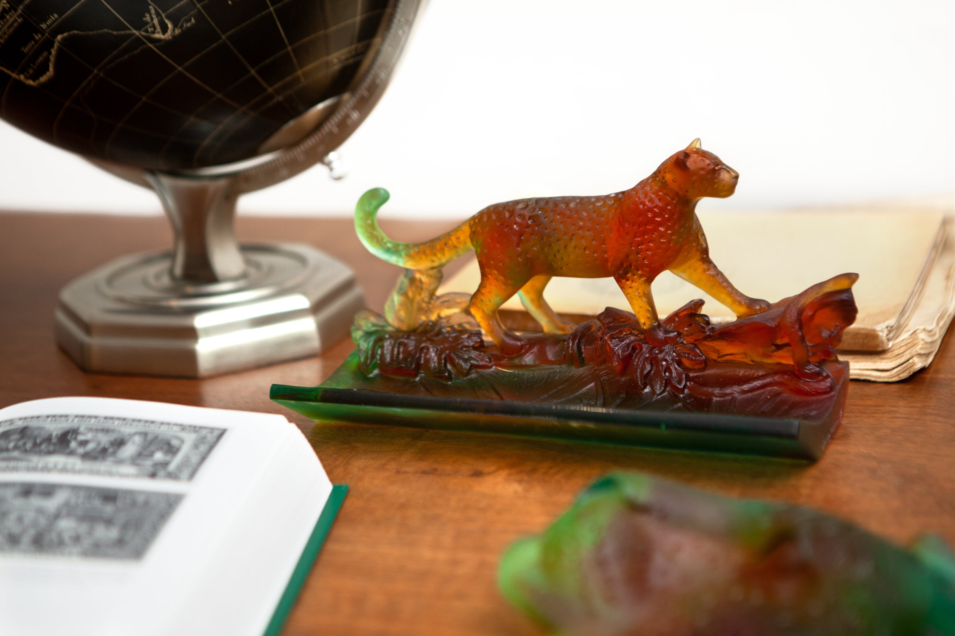 Sculpted from glass paste using centuries-old techniques, these pieces capture the vibrant brilliance of living crystal and reveal the full richness of amber and green hues, evoking the lush colors of the savannah and tropical forests. Each sculpture, from the slender leopard to the refined decorative objects, expresses a graceful movement and a magnetic presence that testify to exceptional craftsmanship.
