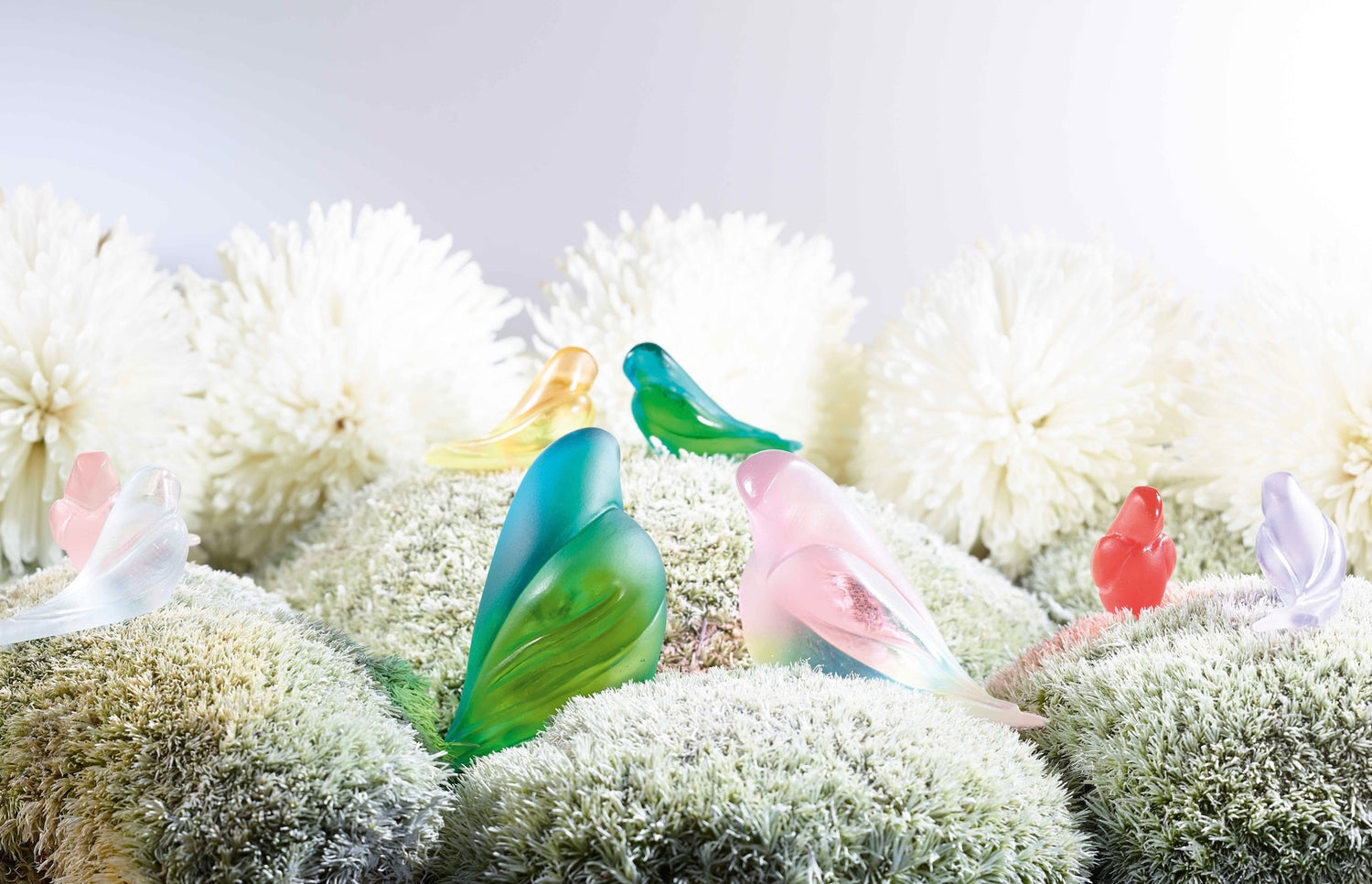 Imaginés par Pierre-Yves Rochon, maître de l’architecture d’intérieur, ces duos d’oiseaux enlacés incarnent l’équilibre parfait entre élégance et intimité. Leurs silhouettes fluides, sculptées avec une précision remarquable, évoquent la légèreté d’un moment partagé, comme murmurant une histoire d’amour sans mots. La pâte de verre révèle des nuances subtiles — framboise, lilas, jaune solaire, bleu, rose tendre — qui se mêlent en transparences colorées et capturent la lumière naturelle, créant un éclat vibrant et vivant.