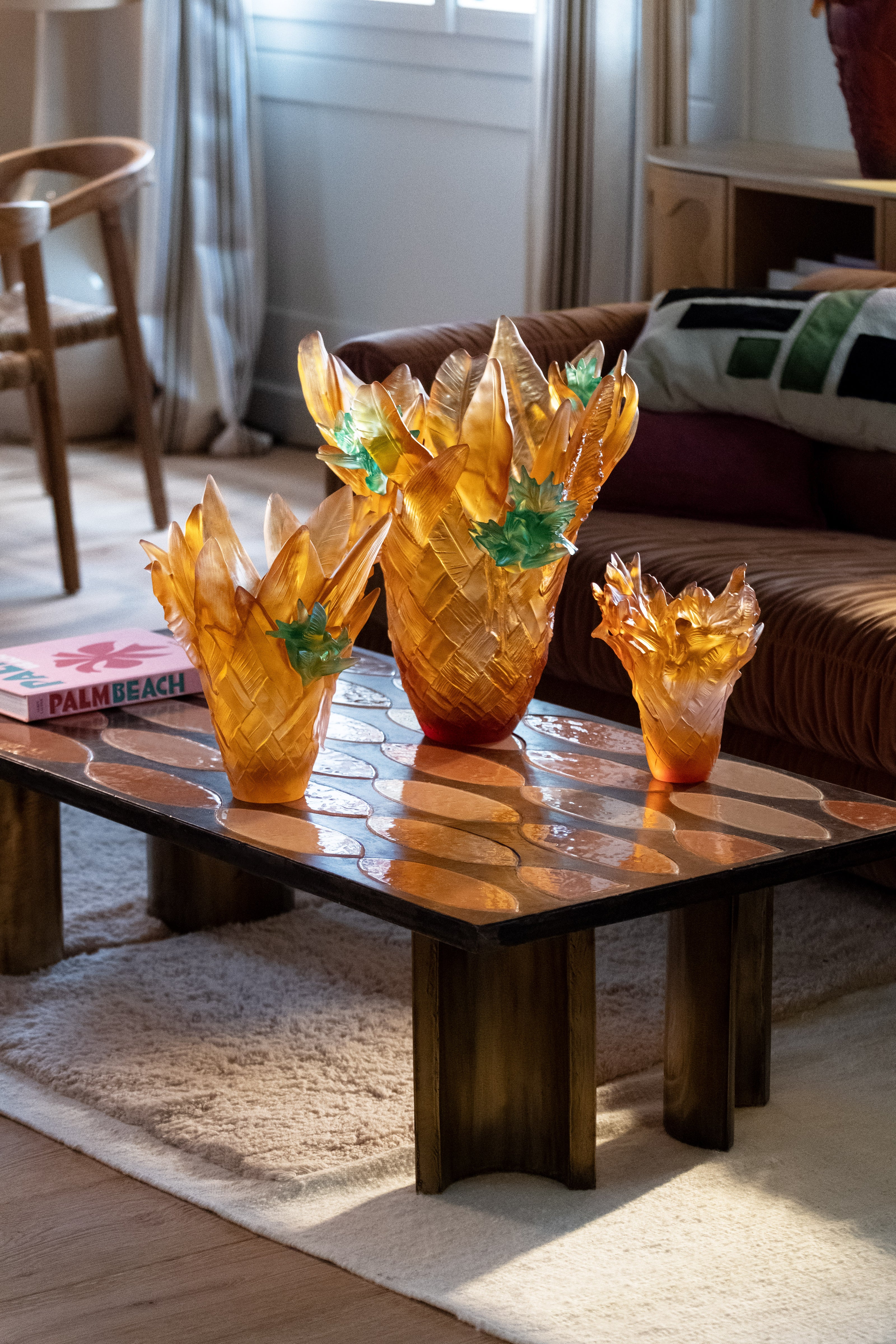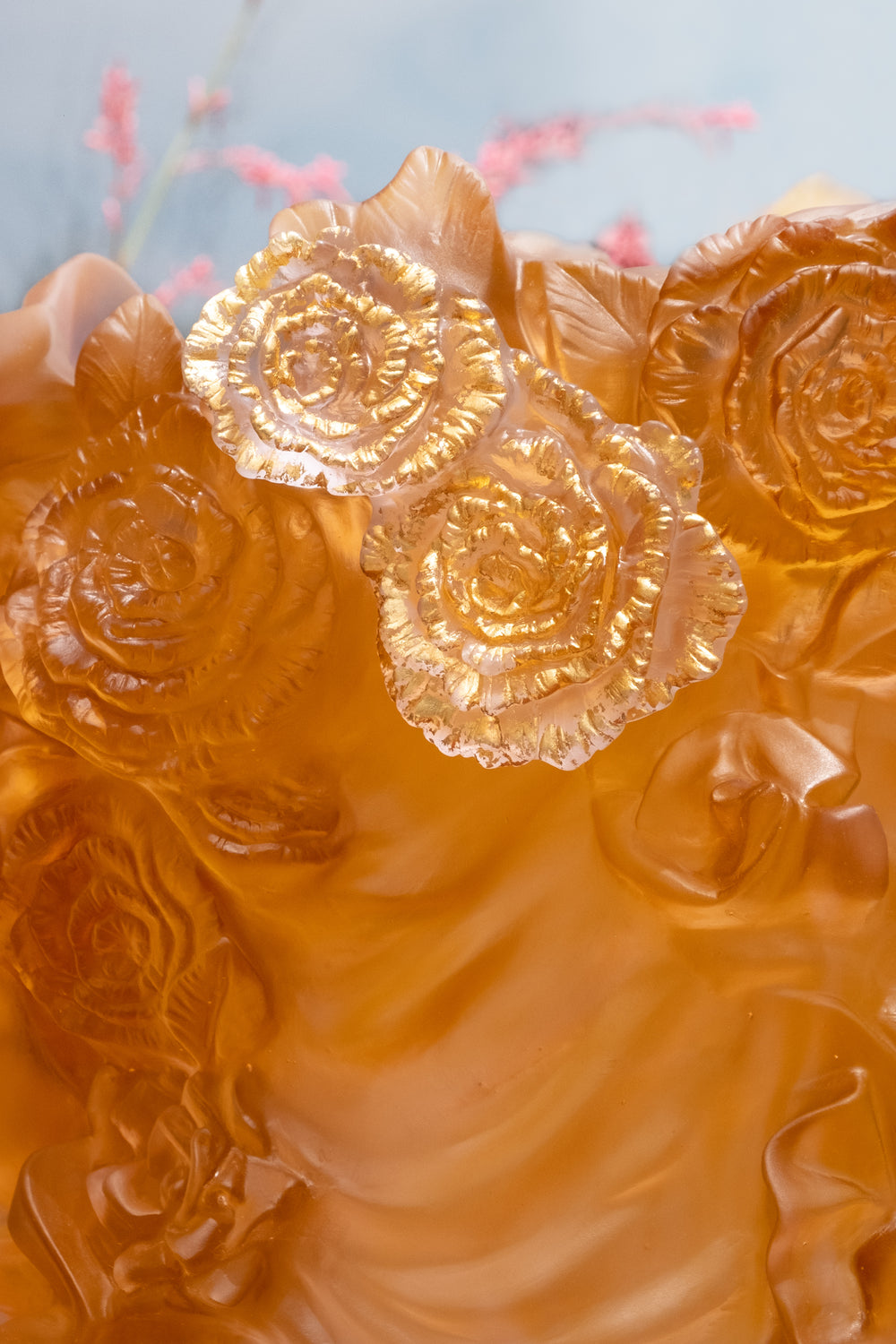 Chez Daum, l’orange n’est jamais uniforme : il se déploie en une infinie variation de transparences et de profondeurs, du ton miel orangé au cuivre incandescent. Cette couleur vivante révèle avec intensité les formes emblématiques de la Maison, pétales en mouvement, chevaux fougueux, ou silhouettes féminines baignées de lumière. Fruit d’un travail minutieux sur les pigments et les oxydes, l’orange naît du dialogue entre la maîtrise technique et la sensibilité artistique. Il illustre à merveille la capacité de Daum à transformer la lumière en émotion, et à faire vibrer la matière jusqu’à l’âme même du cristal. Symbole d’énergie, de passion et de créativité, l’orange demeure une teinte signature de la Maison, témoin du feu intérieur qui anime depuis toujours les ateliers de Nancy.