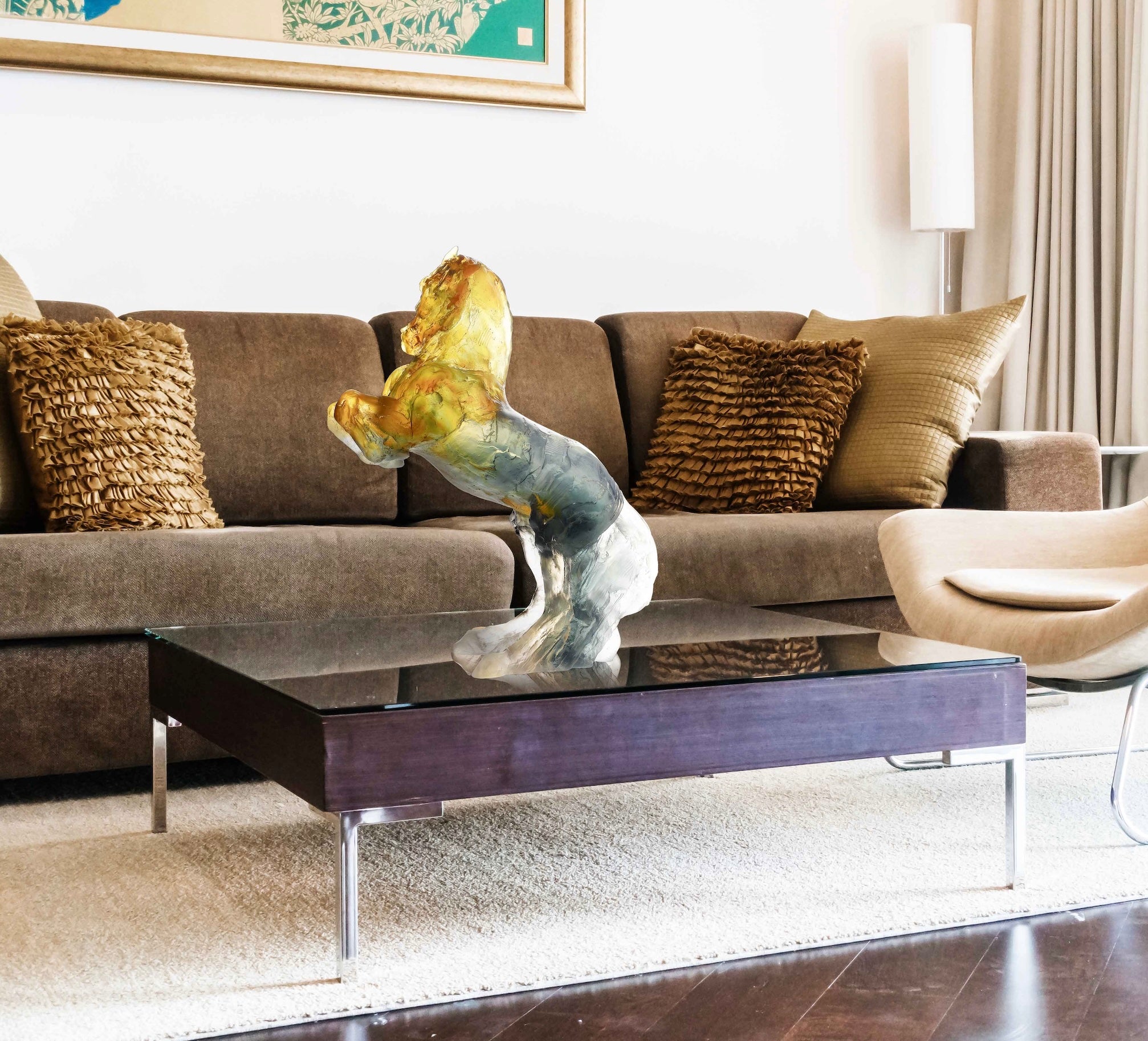 La pâte de cristal, matière noble et vivante, se plie ici à une volonté de capturer le mouvement pur, sans surcharge. Dans les variations chromatiques gris-rose ou ambre-gris, chaque sculpture révèle les vibrations internes de la matière, tout en mettant en lumière la sensualité brute du cheval. Loin de la simple représentation, l’œuvre de Sauvat est un geste arrêté, un souffle cristallisé.