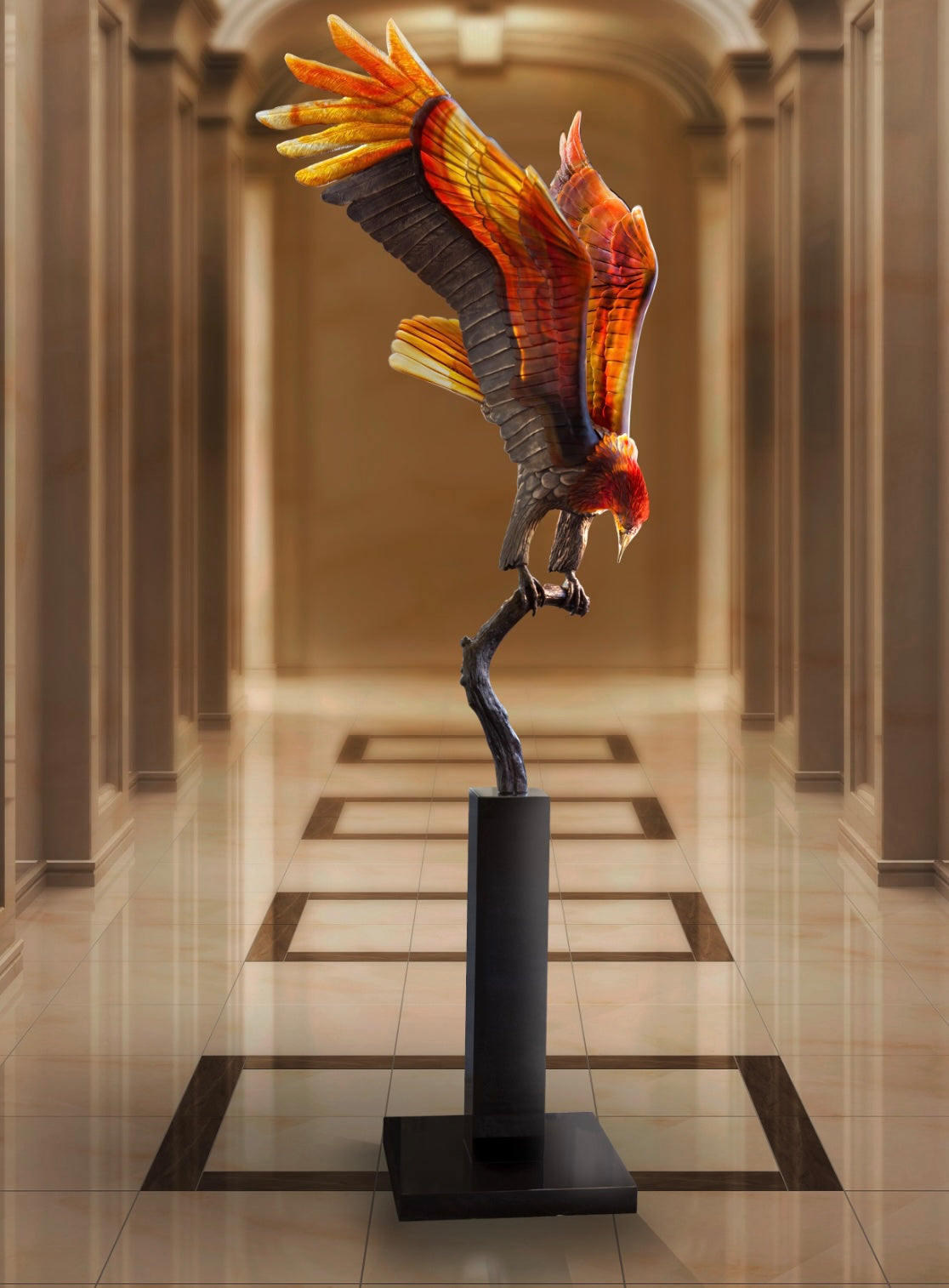Montées sur socles de bronze ou de granit noir poli, ses créations dégagent une présence sculpturale rare. L’aigle royal, le faucon gerfaut, ou encore le paon deviennent sous sa main des symboles de force, de liberté et de vigilance éternelle. Cette collaboration, initiée il y a plus d’une décennie, incarne l’une des expressions les plus prestigieuses du lien entre art animalier, sculpture classique et savoir-faire verrier français.