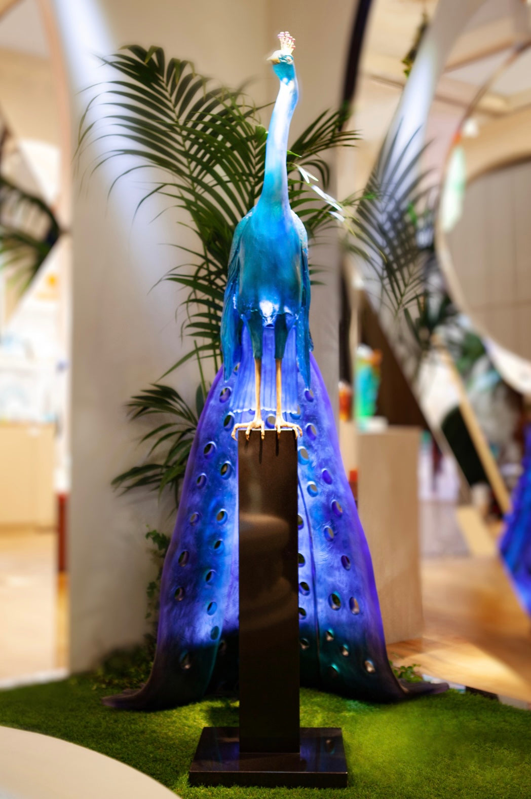 Créé à partir de l’oeuvre originale de Madeleine van der Knoop, le Paon Tropical en cristal a été réalisé par les ateliers Daum suivant la technique de la cire perdue. Le cristal sculpte la lumière et révèle l’extrême élégance du paon et son plumage ocellé. Les magnifiques nuances de couleurs du cristal bleu-vert et violet, sublimées par les yeux en diamants et améthystes, mettent en lumière la beauté de cet animal ornemental. Un savoir-faire unique a été nécessaire pour la réalisation de cette oeuvre exceptionnelle. Elle impressionne par sa beauté lumineuse, par sa présence spectaculaire et ses finitions précieuses.
