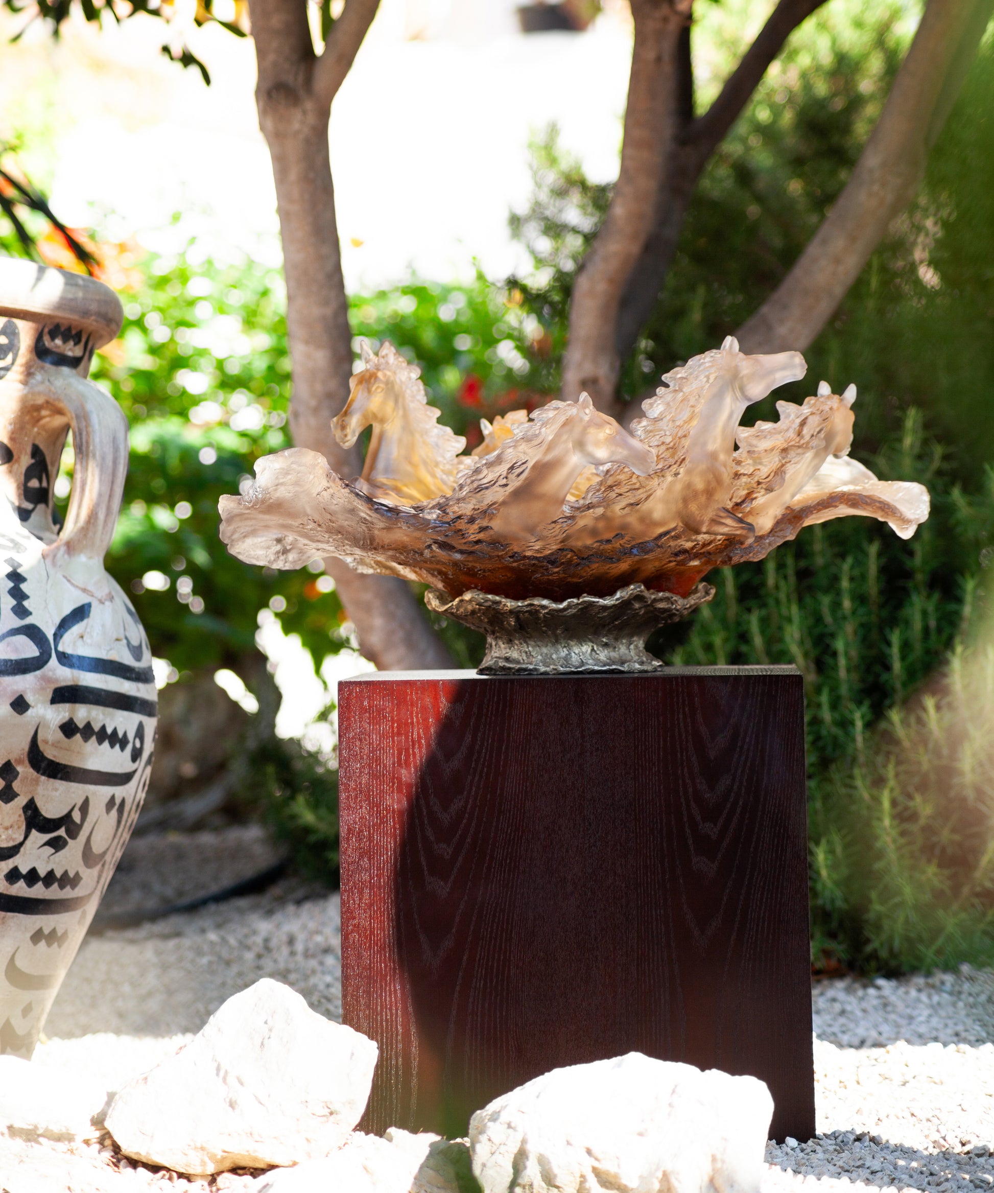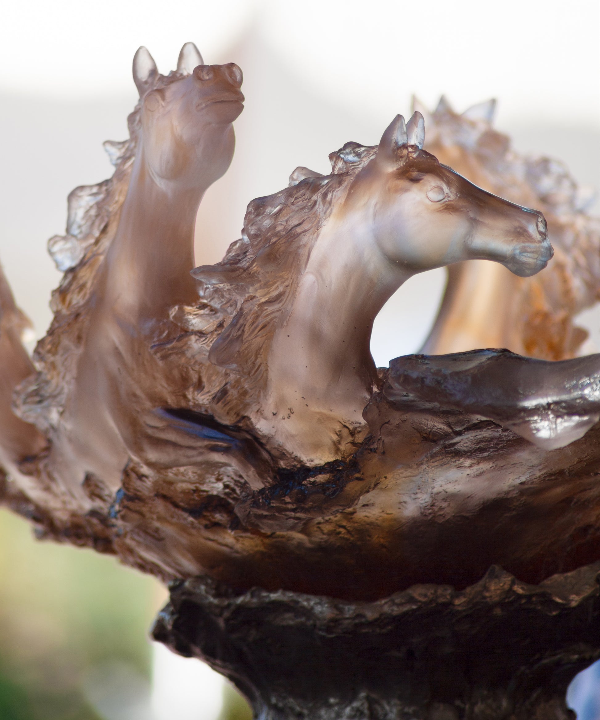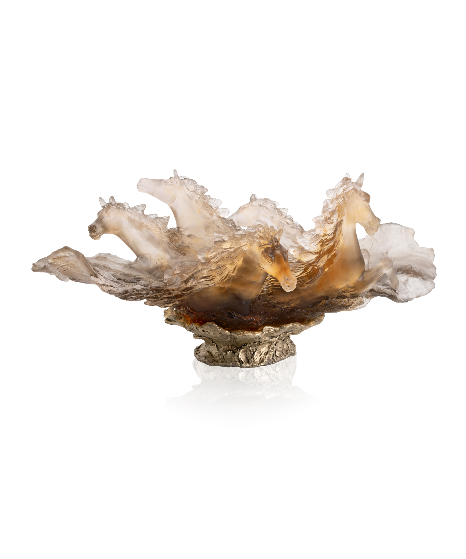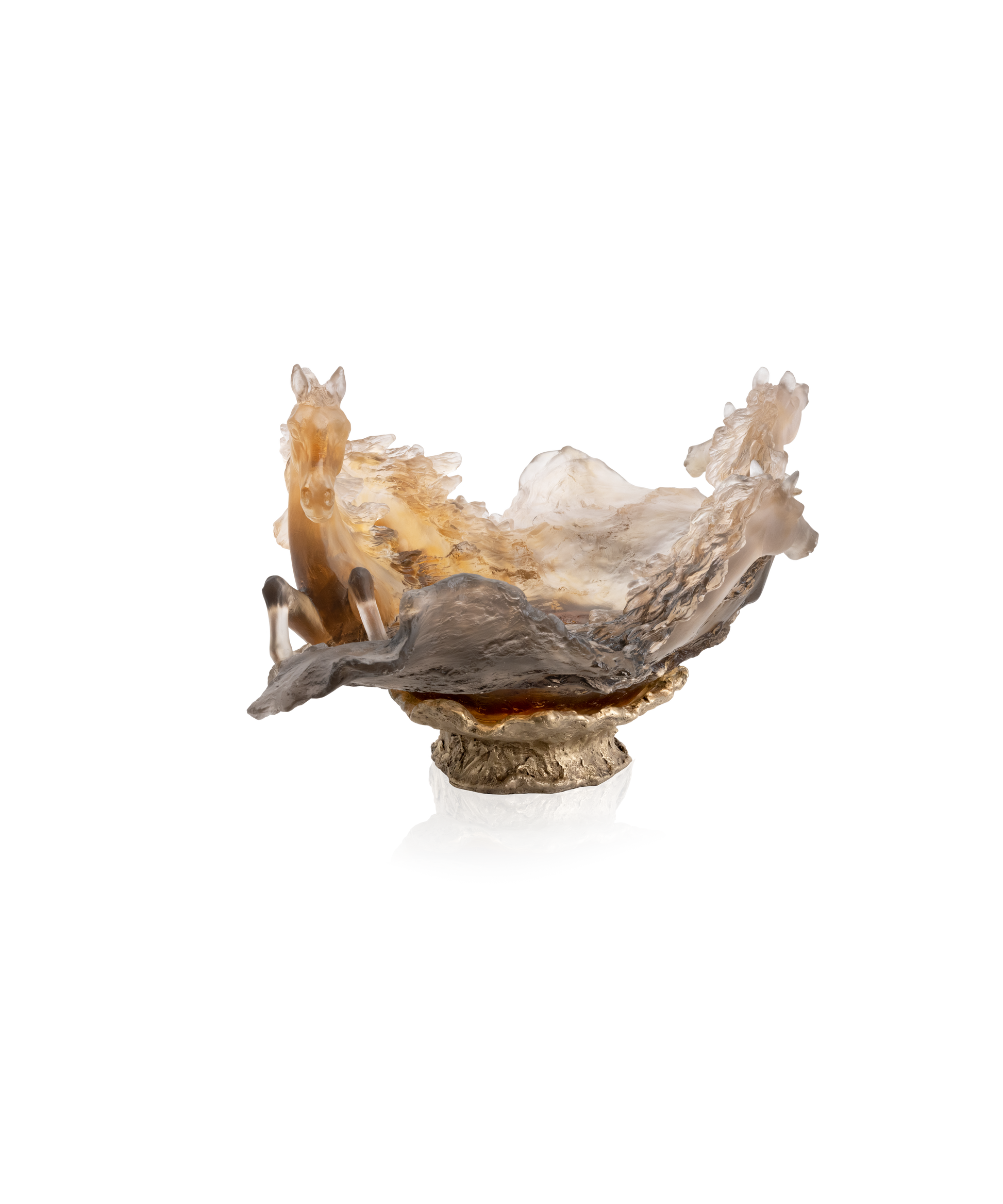 Le Centre de table cavalcade Brun glacé 125ex, issu de la collection Cavalcade, évoque la puissance du monde sauvage. Réalisé en pâte de verre, il révèle une énergie captivante et la lumière qui caresse la matière. Ses jeux de lumière et de transparence subliment le souffle de la nature, créant une aura fascinante. Chaque détail témoigne d’un savoir-faire d’exception et d’une passion pour la création. Une œuvre poétique et intemporelle signée Daum, où l’art et la nature s’unissent.