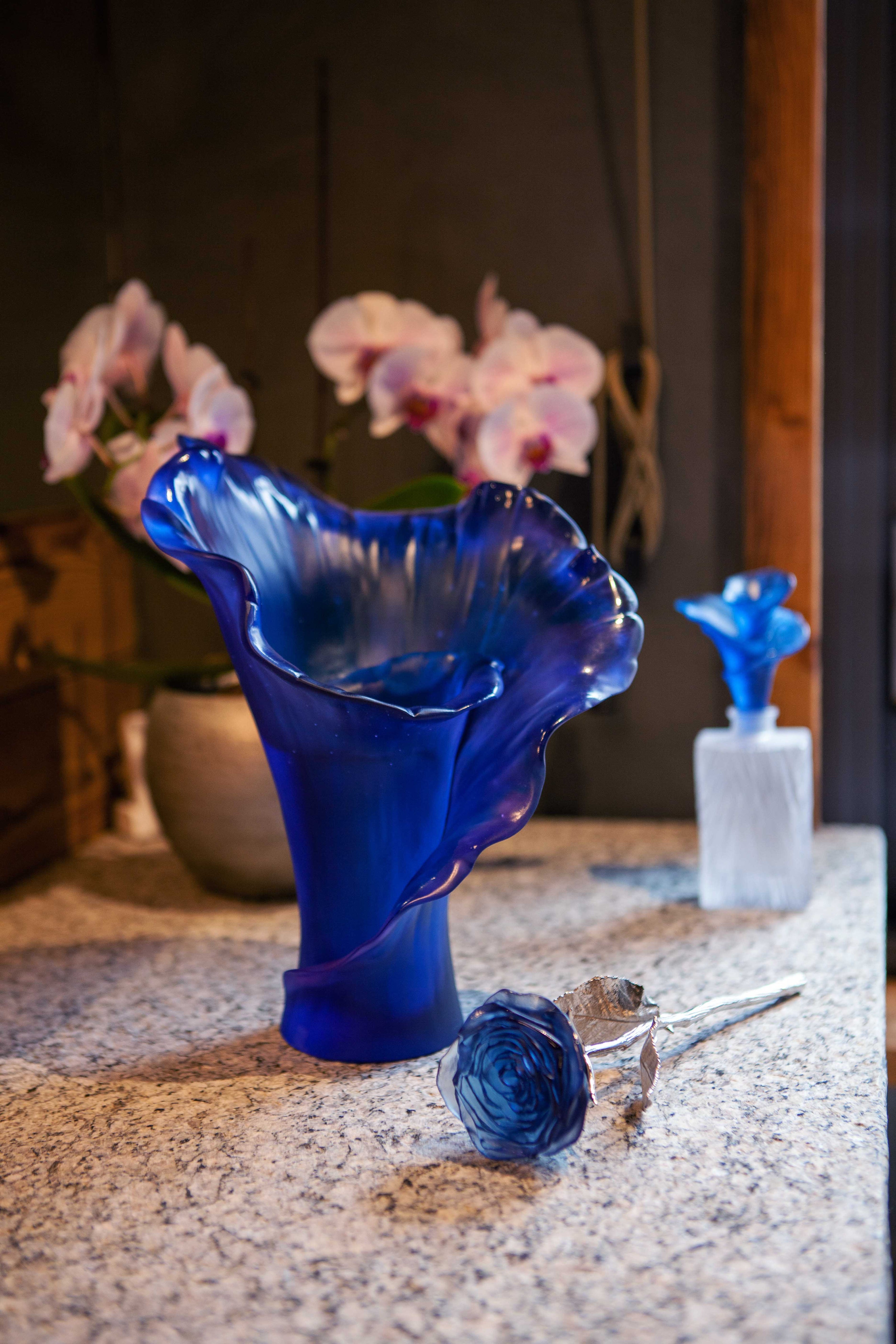 Chaque pièce, unique, capture la vibration de la couleur et la transforme en matière vivante. Chez Daum, le bleu incarne la pureté, la rêverie et la modernité. Il se glisse dans les vagues d’une collection marine comme Maya ou Mar de corail, illumine les pétales d’une fleur imaginaire et figurative comme l’arum, ou souligne la grâce d’une silhouette sculptée. Jouant avec la lumière, il traverse le cristal comme un souffle d’air ou un reflet d’eau, créant un dialogue infini entre transparence et profondeur. Les bleus de Daum ne sont pas une simple couleur : ils sont une langue de lumière, l’expression poétique du savoir-faire français et de la beauté intemporelle de la matière.