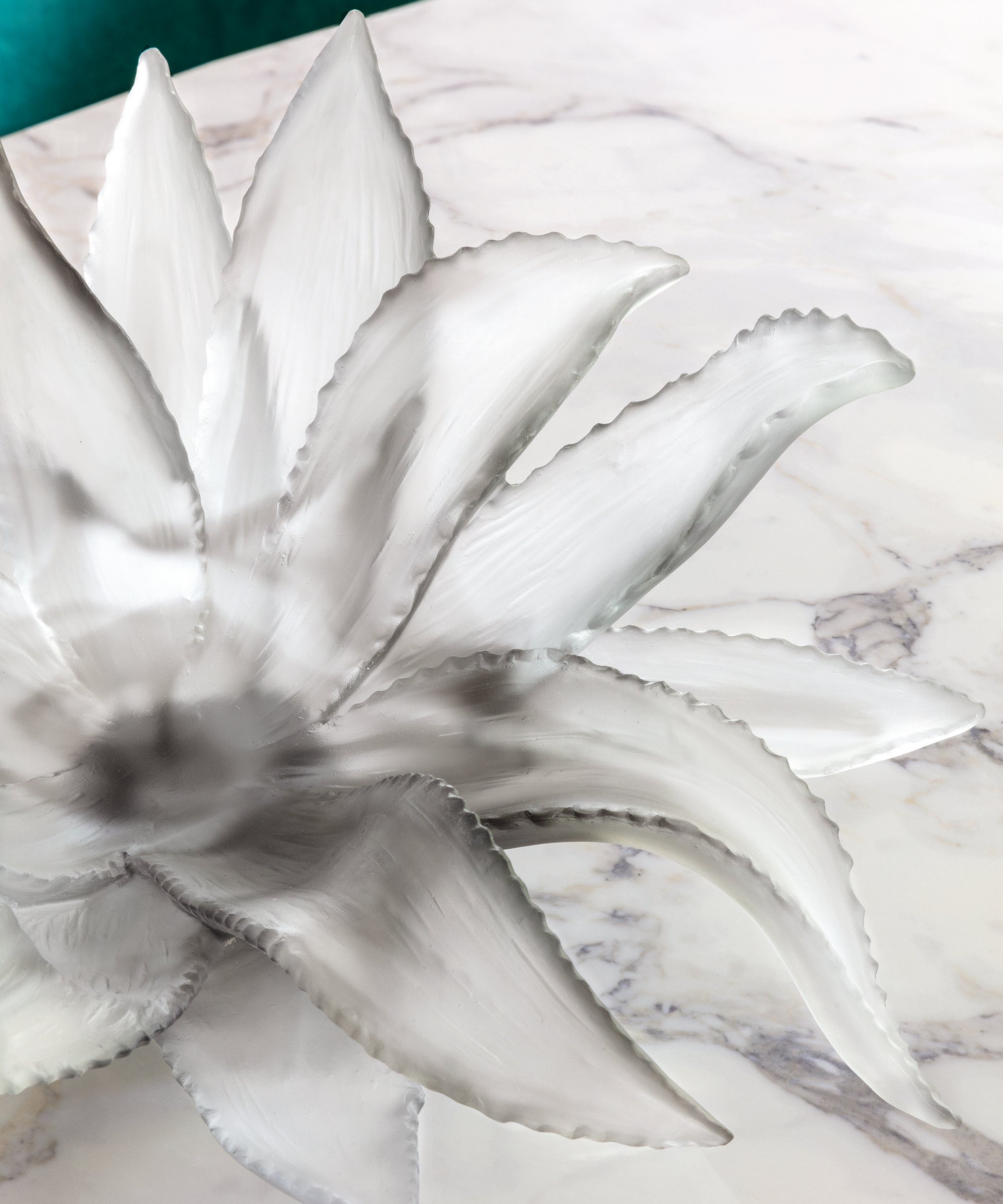 Jardin de Cactus Centre de table Gris de Emilio Robba 375ex, issu de la collection Jardin de Cactus, évoque l’éclat des feuillages cristallins. Réalisé en pâte de verre, il révèle la lumière jouant sur les pétales de cristal et un hommage à la nature florissante. Ses jeux de lumière et de transparence subliment la douceur des formes organiques, créant une aura fascinante. Chaque détail témoigne d’un savoir-faire d’exception et d’une passion pour la création. Une œuvre poétique et intemporelle signée Daum, où l’art et la nature s’unissent.