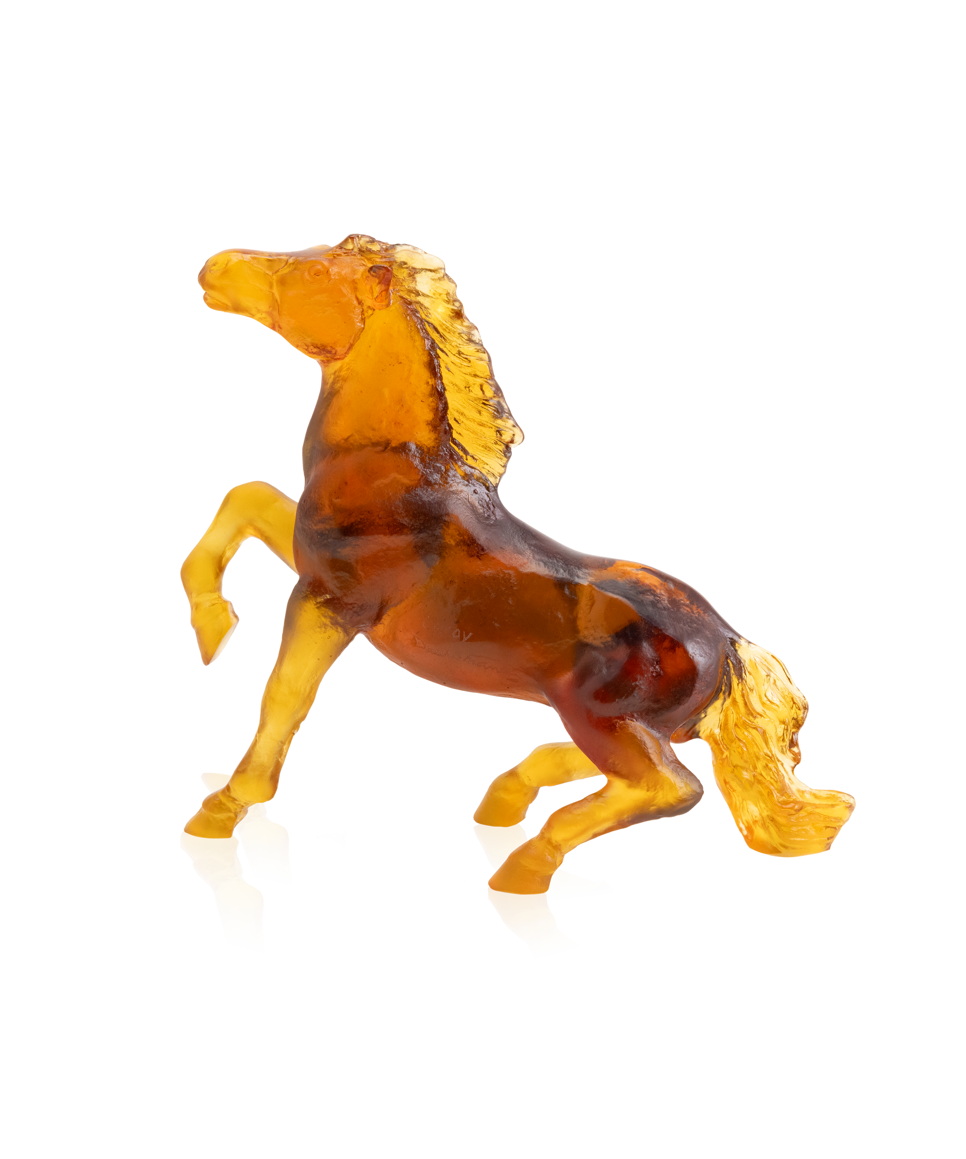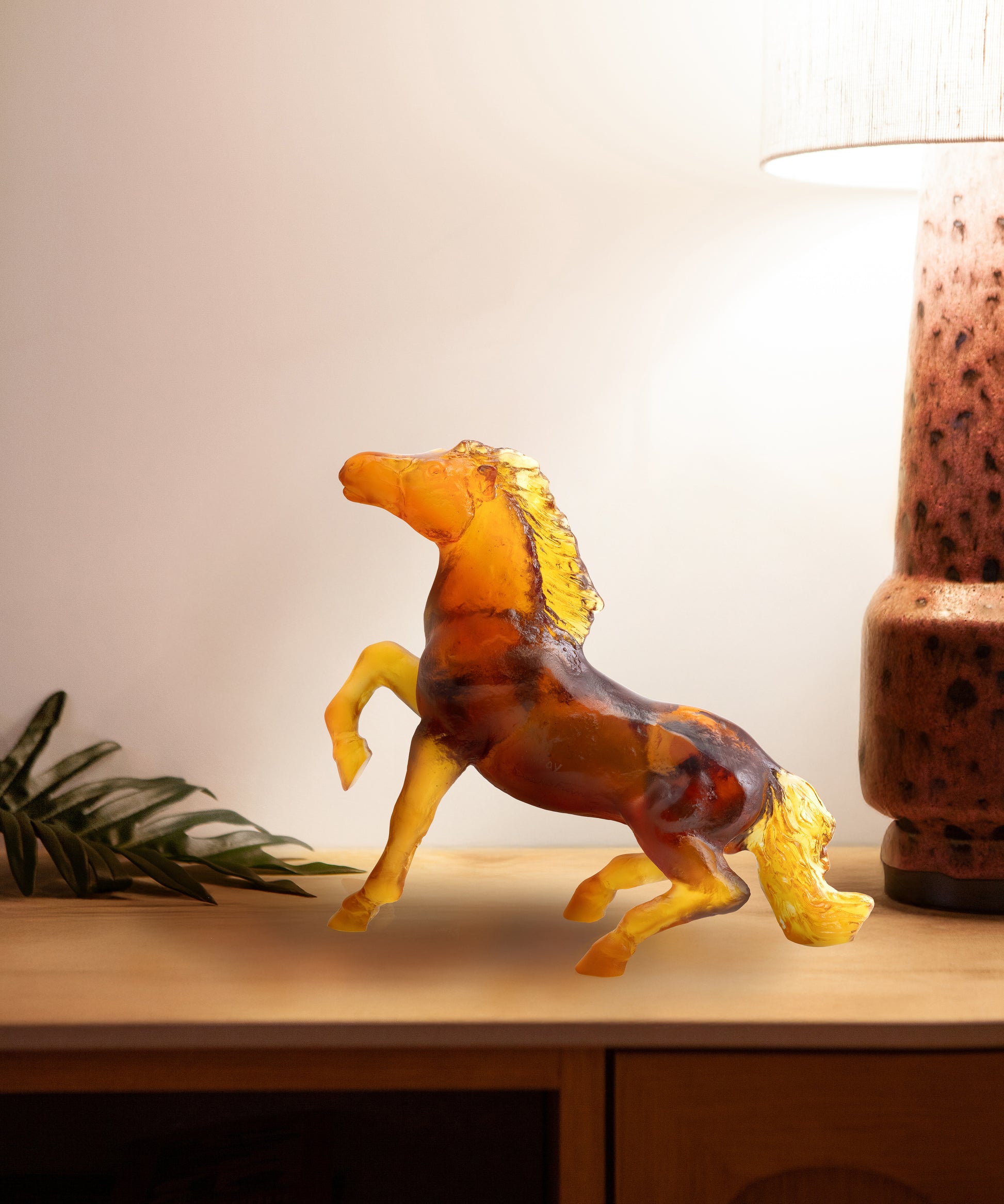 Inspirée par la grâce sauvage et l'endurance des chevaux galopant librement dans la nature, cette sculpture est plus qu'un objet d'art. Elle est un hommage à la force et à la beauté indomptées. Créée par Jean-François Leroy et réalisée avec la technique séculaire de la pâte de verre, cette sculpture en cristal marron illumine chaque détail avec des éclats de lumière et des transparences colorées, capturant l'essence même du mouvement éternel. Cette présence magnétique, imposante et élancée, invite à la contemplation, évoquant les vastes plaines où la nature règne en maîtresse. Une véritable œuvre d'art qui capture la lumière naturelle et transforme chaque espace en un paysage d'admiration.