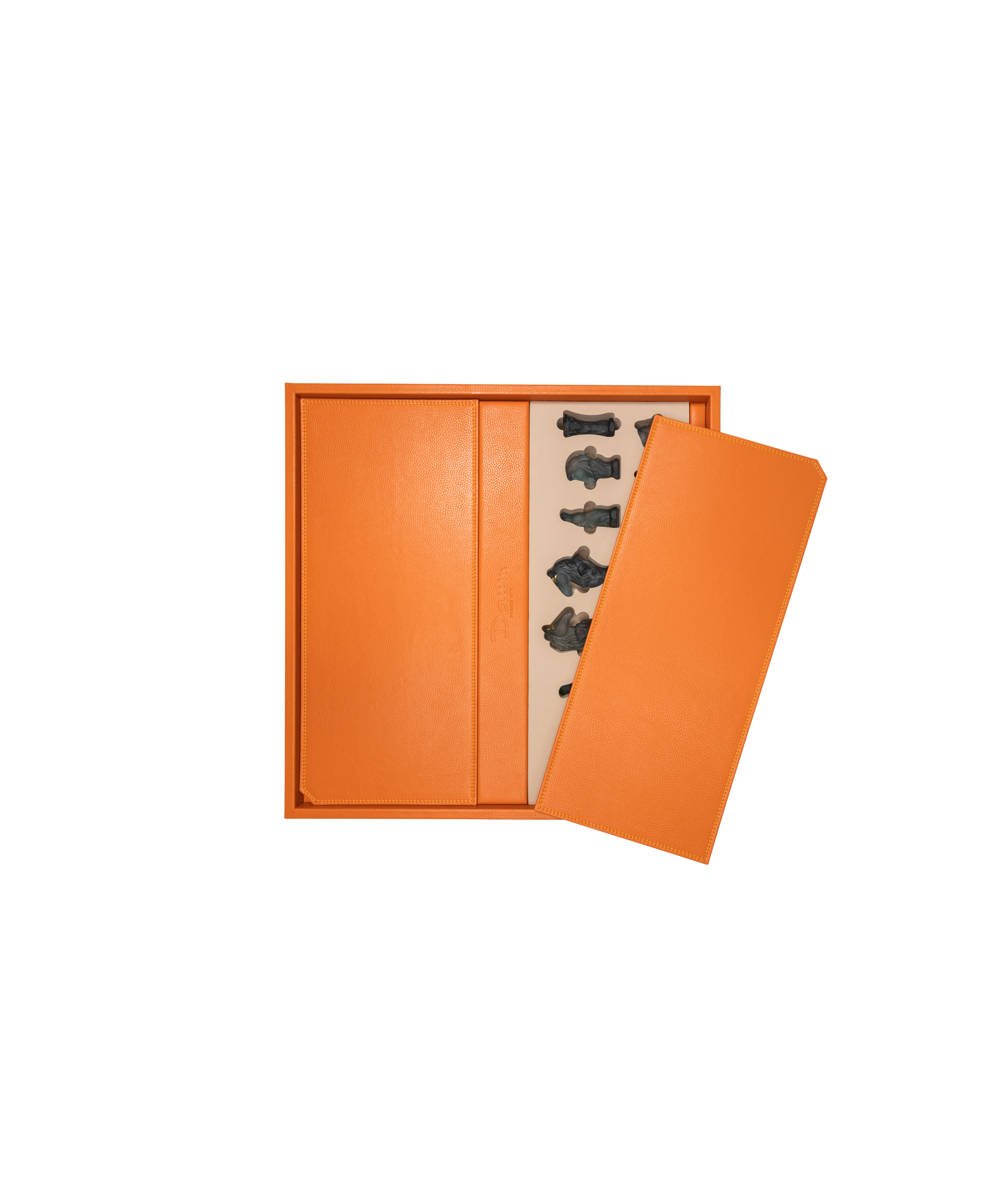 • Plateau de jeu en marqueterie de cuir orange et bleu marine – surpiqué ton sur ton : L : 61 cm x l : 59 cm