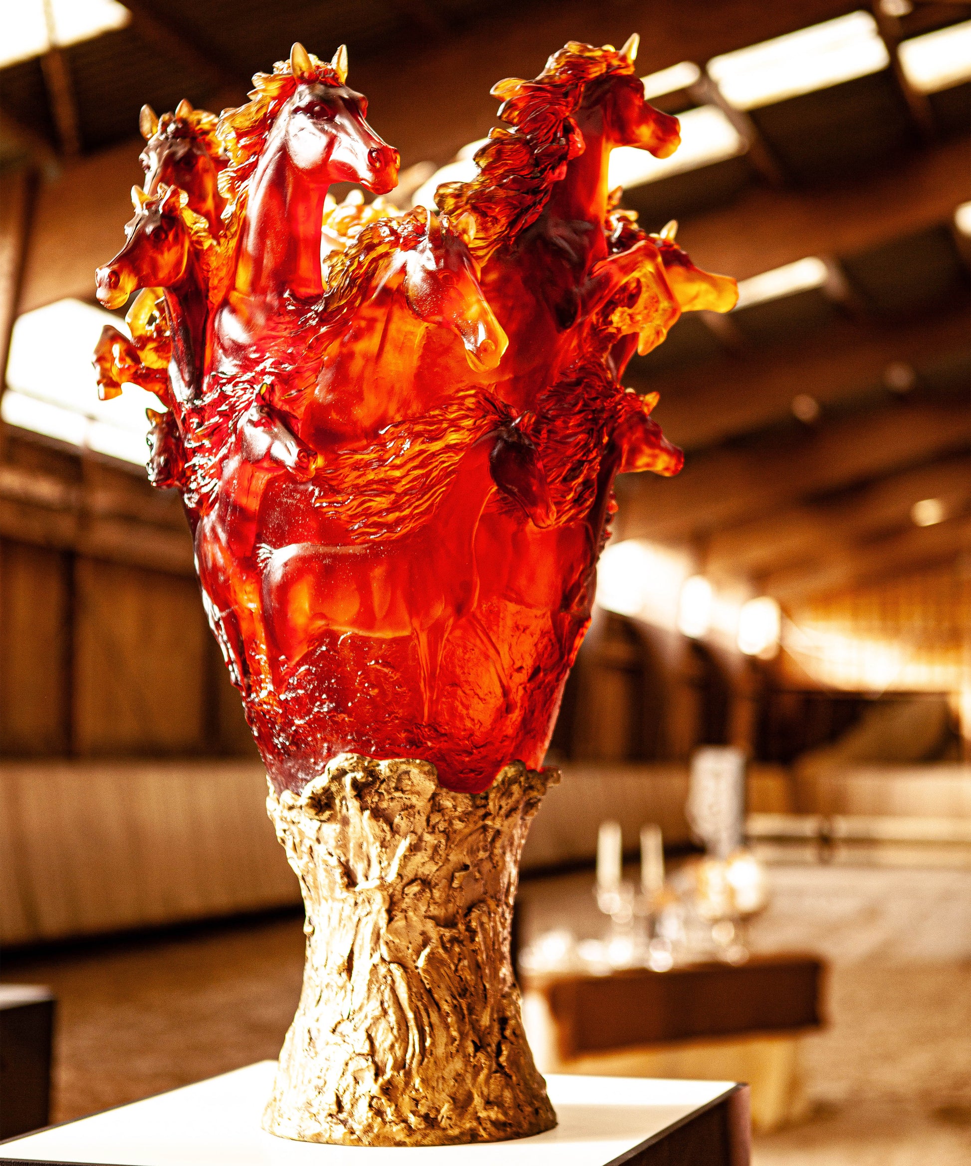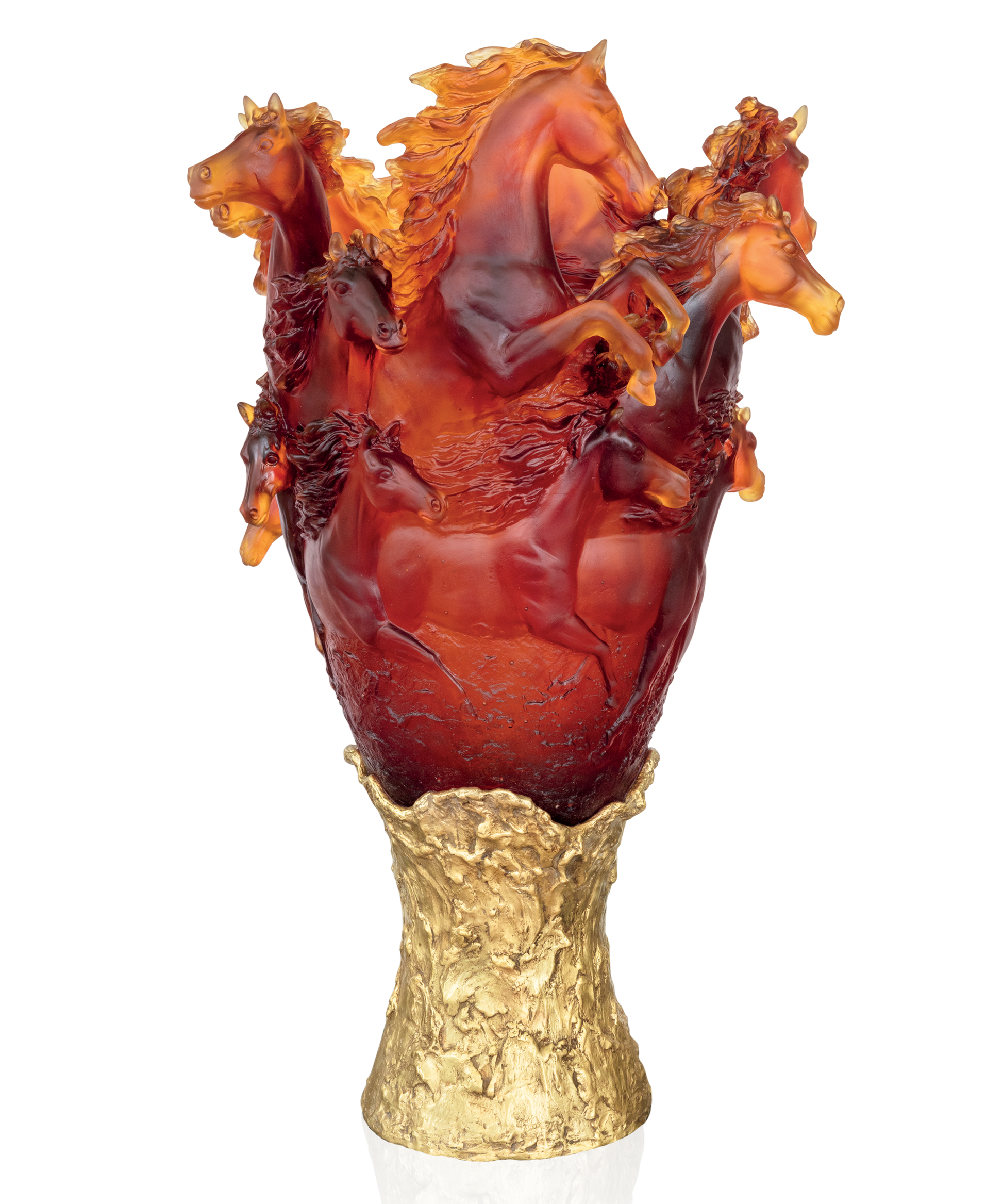 Cavalcade Vase prestige Ambre 50ex, issu de la collection Cavalcade, évoque la noblesse du mouvement. Réalisé en pâte de verre, il révèle l'élégance naturelle et la puissance du monde sauvage. Ses jeux de lumière et de transparence subliment la lumière qui caresse la matière, créant une aura fascinante. Chaque détail témoigne d’un savoir-faire d’exception et d’une passion pour la création. Une œuvre poétique et intemporelle signée Daum, où l’art et la nature s’unissent.