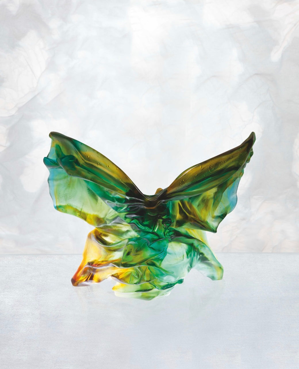 La collaboration avec Daum cristallise cette vision : le Soliflore Papillon est une sculpture-pivot, fusion harmonieuse entre Orient et Occident. Les transparences et les nuances chatoyantes de la pâte de cristal, travaillées avec virtuosité, capturent le souffle d’un papillon en vol, métaphore poétique de la beauté éphémère rendue éternelle.