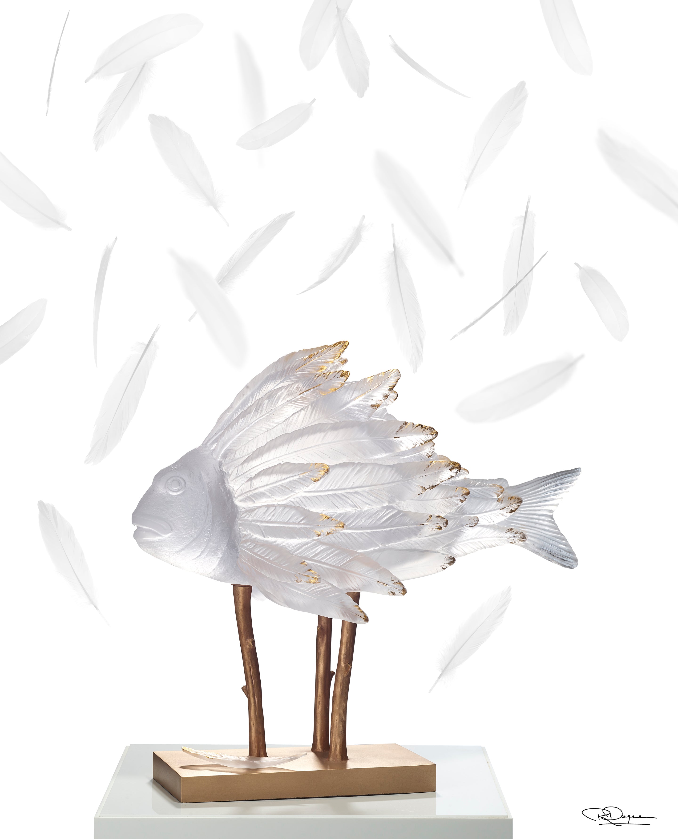 Édition d’art contemporain créée en collaboration avec une figure renommée du monde de l’art.Deuxième pièce de l’artiste pour Daum, après une première version en cristal coloré. Nouvelle version en pâte de cristal blanche, sublimée par des touches d’or, rappelant la magie des fêtes. Légèreté et transparence du cristal blanc, rehaussées par la préciosité de l’or appliqué sur les plumes. Exigeante à travailler, la pâte de cristal blanche demande une attention minutieuse pour un rendu parfait, fidèle aux standards de la Maison Daum.