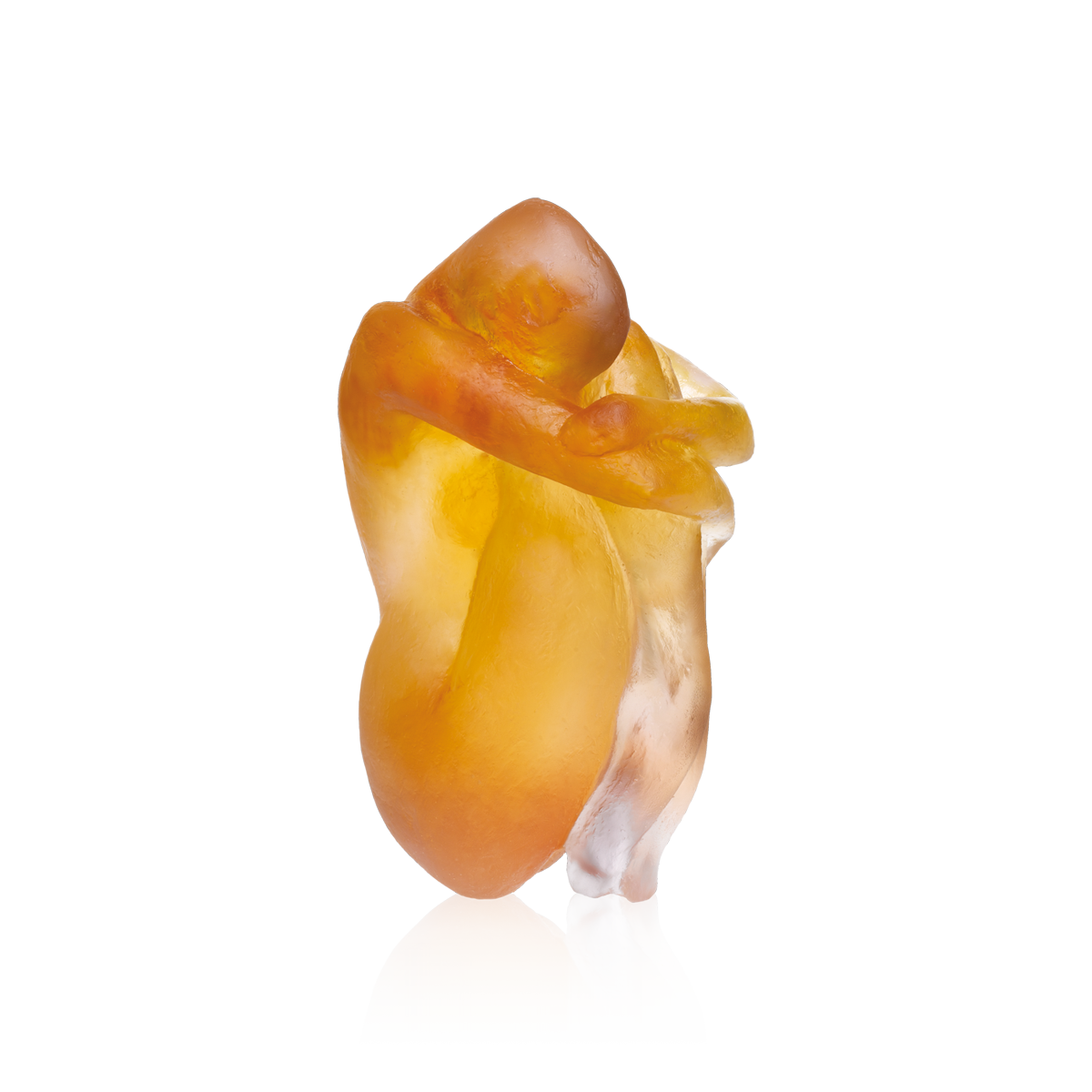 Inspirée par le mystère et la grâce féminine, cette œuvre évoque une danse secrète de l'amour. La cristallisation ambre, obtenue grâce à la technique séculaire de la pâte de verre, donne vie à cette silhouette délicate avec des nuances d'orange. Le savoir-faire de Daum, associé à la sensibilité artistique de Sylvie Mangaud, offre une expression saisissante et une présence magnétique. Cette sculpture apporte une touche d'élégance et de poésie à votre espace, invitant à la contemplation de la beauté éternelle du mouvement et de l'émotion.