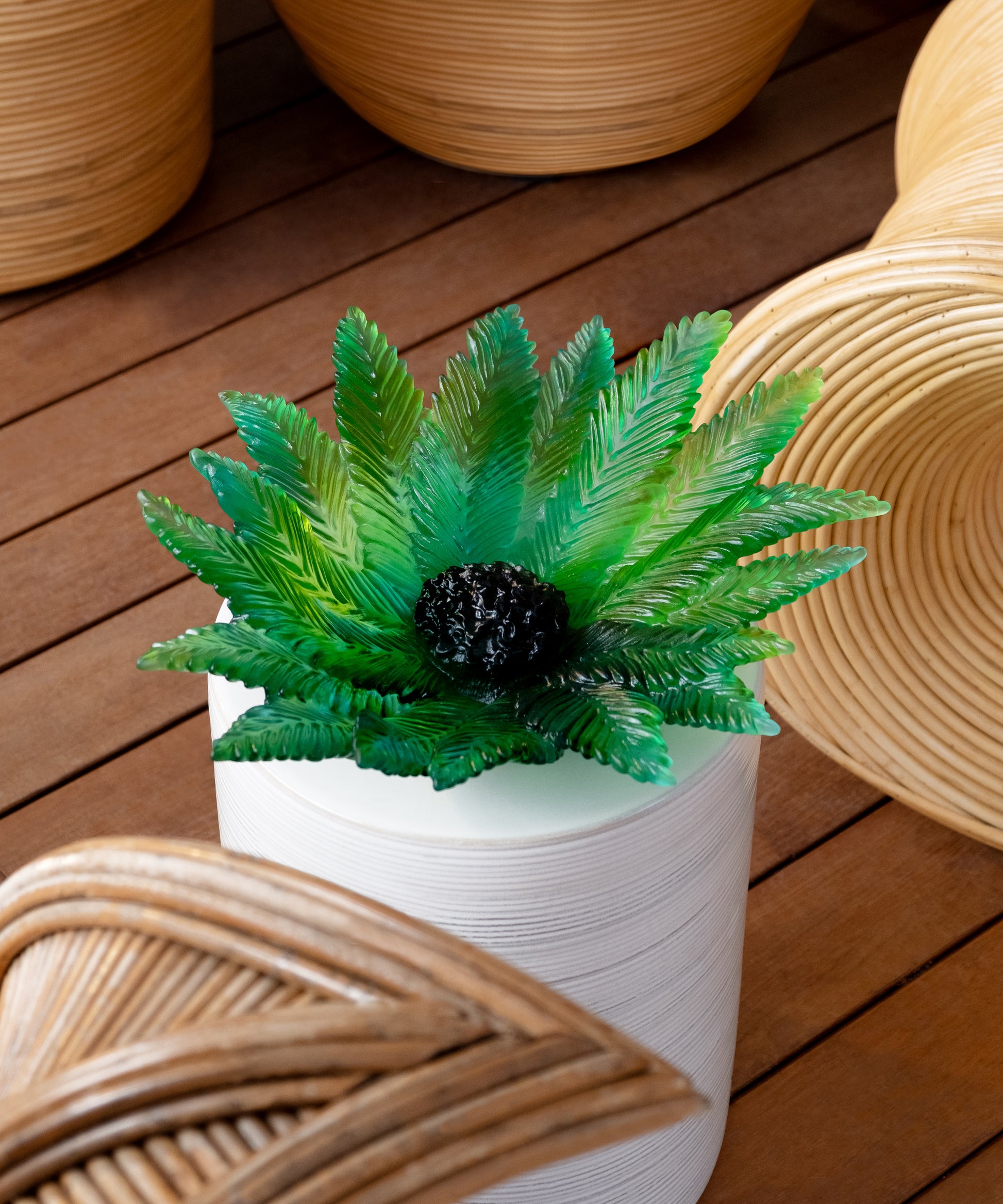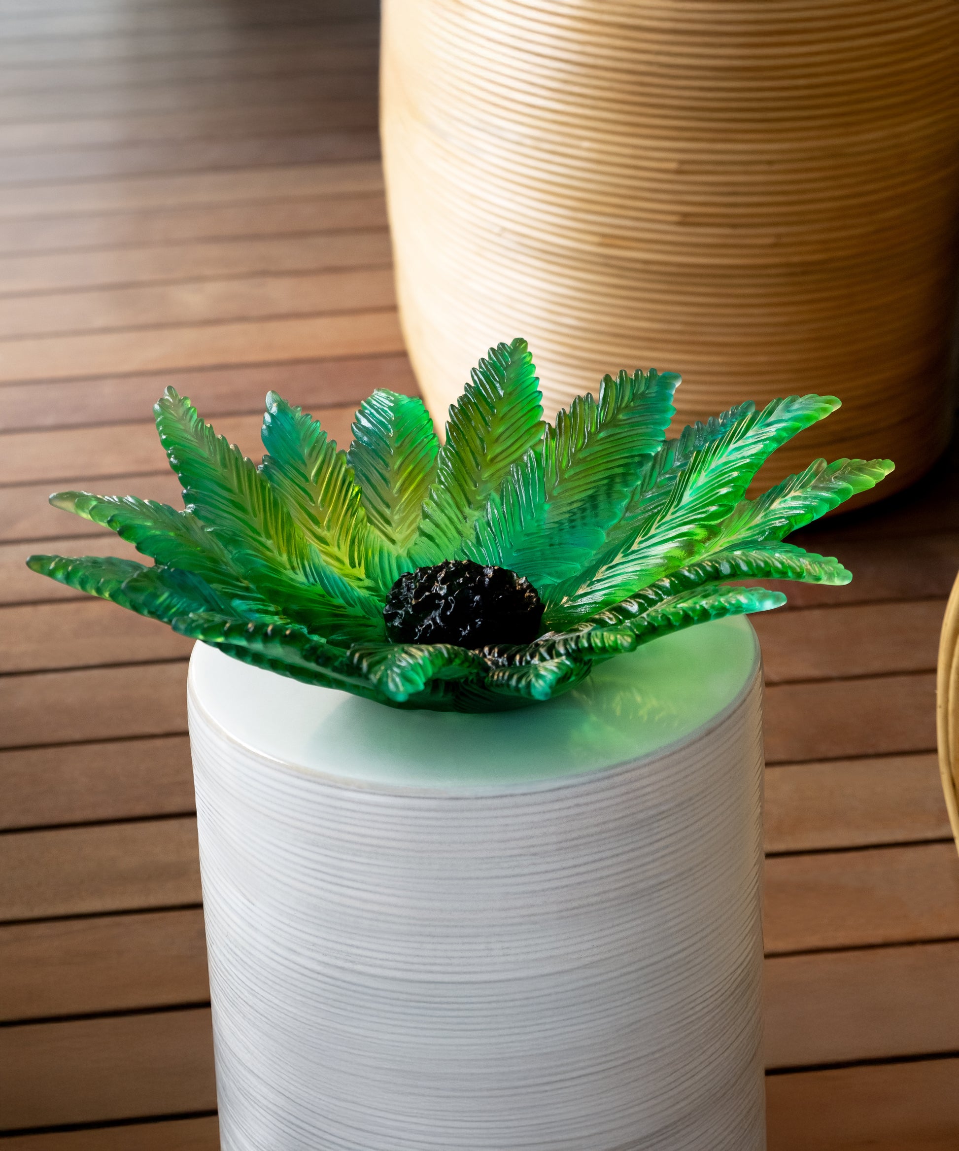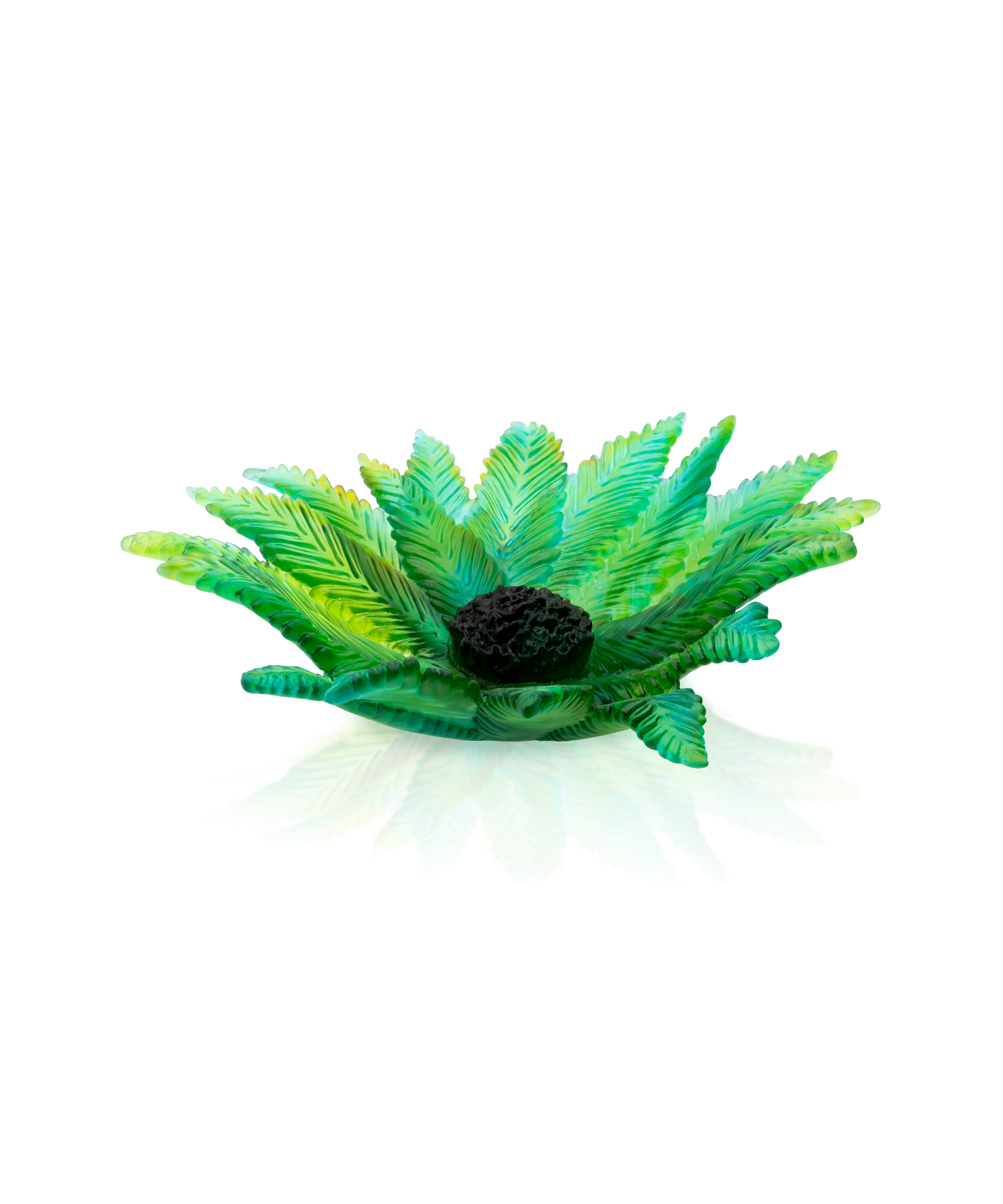 Inspiré de l'exubérance d'une oasis tropicale, ce centre de table évoque l'ambiance luxuriante de Palm Beach. Confectionné avec une maîtrise artisanale séculaire, ce magnifique objet d'art made by Daum, allie technique de la pâte de verre et nuances subtiles, pour un rendu visuel éblouissant. Son cristal vivant, aux transparences colorées, déploie une symphonie de lumière dans votre intérieur, invitant à la contemplation.