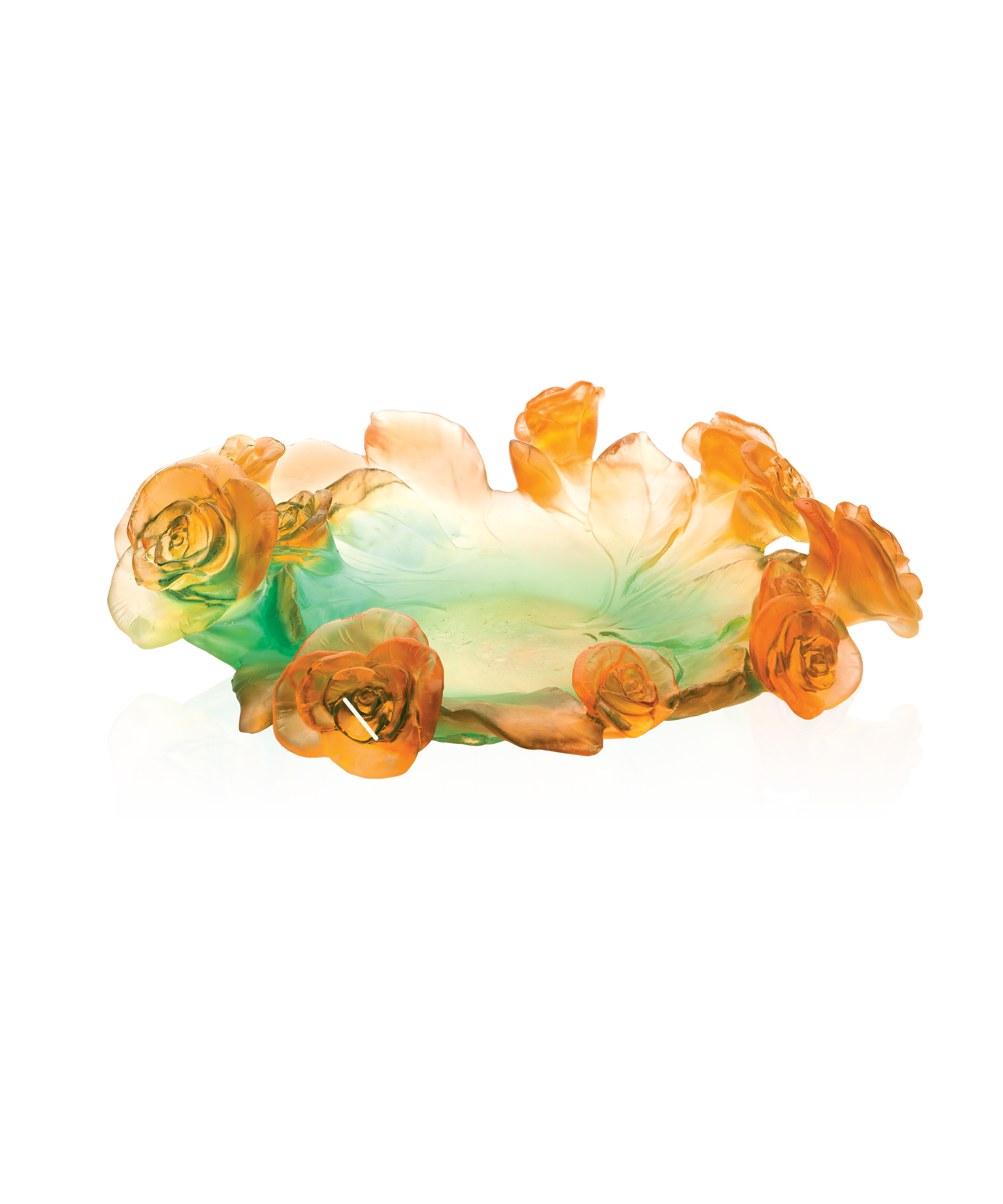 Inspirée de la majesté d'une rose en pleine éclosion, cette coupe Daum est une ode à la nature. La pâte de verre, technique séculaire maîtrisée par Daum, est ici sublimée en un éclat de couleurs, du vert luxuriant à l'orange flamboyant, faisant écho à la beauté des jardins. Sa transparence colorée capture la lumière naturelle, la transformant en éclats scintillants qui évoquent les saisons. Délicatement posée dans votre intérieur, cette coupe devient plus qu'un objet, une invitation à la contemplation, un moment de pause pour admirer la beauté et l'élégance du cristal vivant.