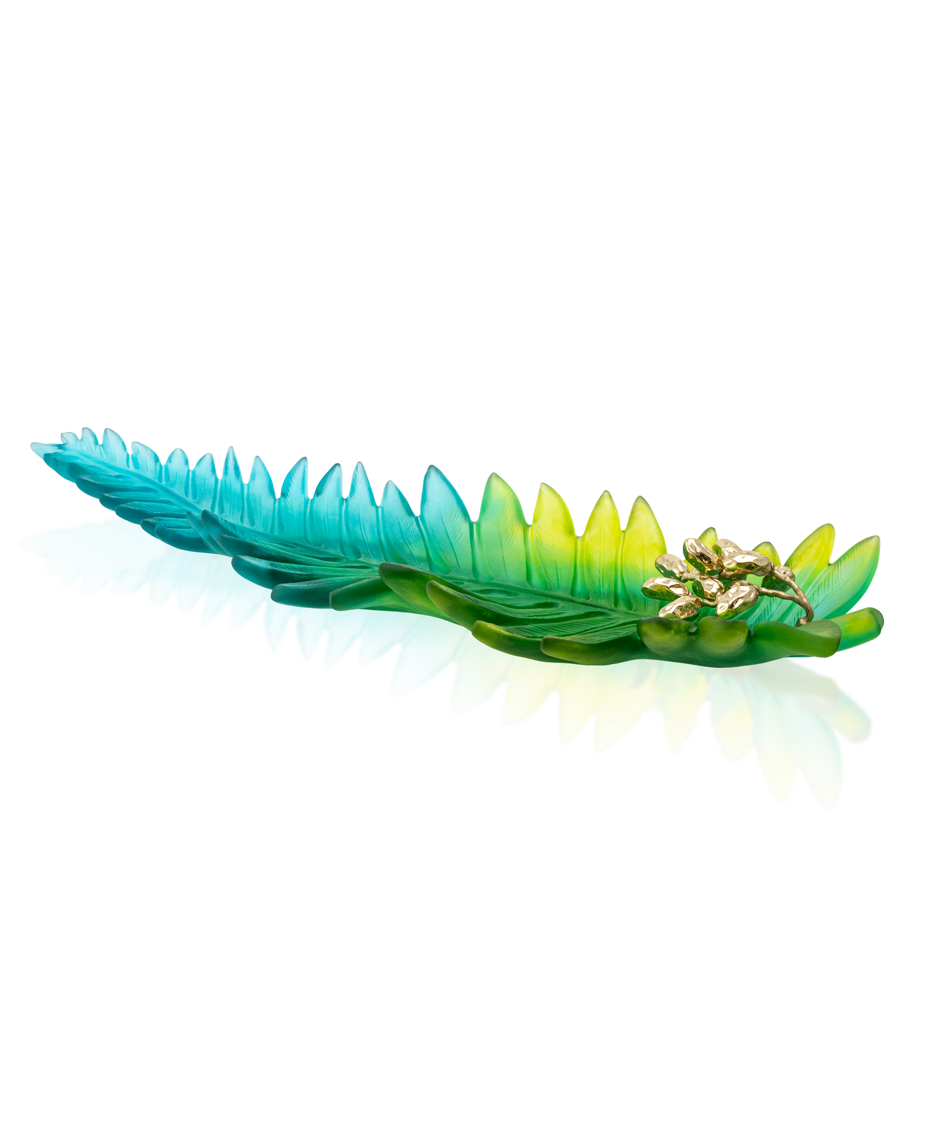 Le vase Prestige est la pièce maîtresse de la collection Palm Beach. Cette œuvre sculpturale s’impose par sa silhouette élancée, avec ses longues feuilles de palmier déployées en éventail, qui rendent hommage à la majesté des arbres tropicaux. Les dégradés de bleu turquoise et de vert jungle qui ornent les feuilles offrent à la sculpture de sublimes jeux de lumière, comme si la lumière était filtrée par une végétation luxuriante. Le vase repose sur un socle en bronze patiné, orné d’une branche de dattes finement travaillée en cristal et en bronze. Ce détail témoigne de la finition apportée à cette pièce d’exception.