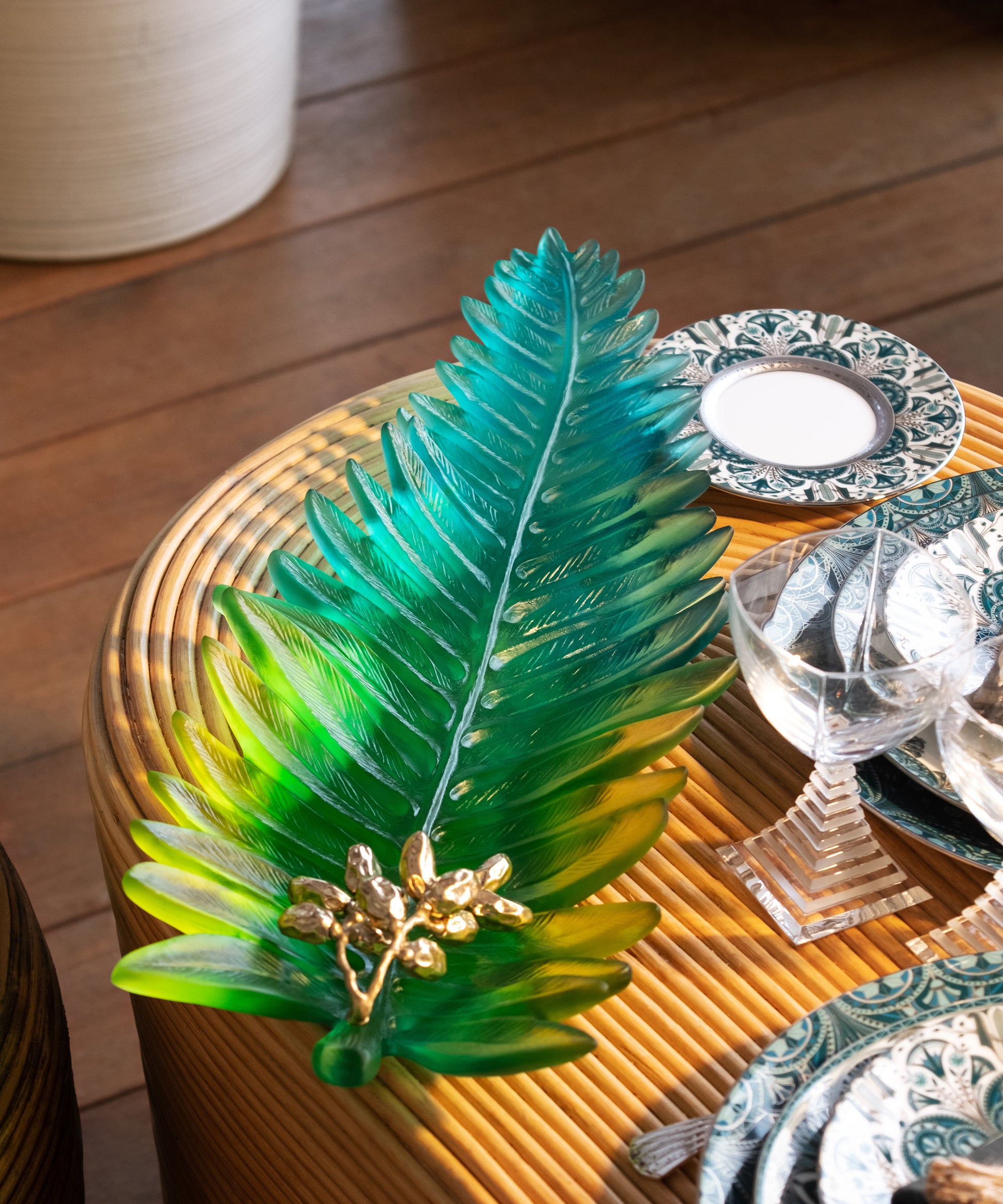La collaboration avec Emilio Robba, artiste en résidence chez Maison Daum, renforce encore cette approche sensible et poétique de l’univers tropical. Loin d’être de simples reproductions de la nature, les pièces de la collection Palm Beach traduisent une émotion, celle que l’on ressent devant la beauté sauvage et singulière d’un paysage tropical, entre ciel bleu et feuillage luxuriant baigné de lumière. Avec Palm Beach, la Manufacture Daum et Emilio Robba signent une collection capable de capturer la puissance décorative des tropiques et de la retranscrire avec une finesse inégalée, offrant ainsi une interprétation artistique inédite de l’univers tropical.