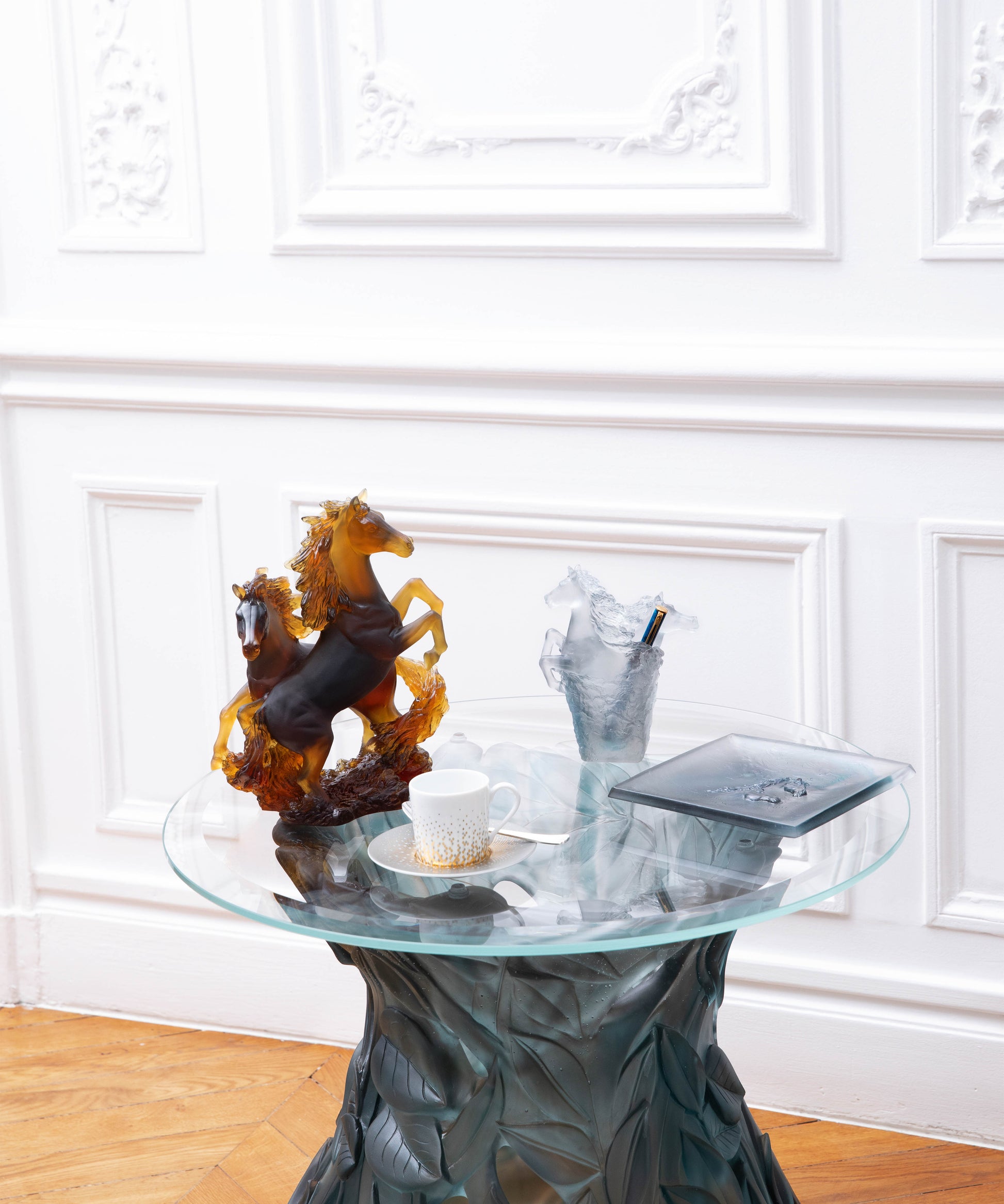 Inspiré de la majestueuse danse des chevaux sauvages, ce vide-poche évoque la liberté et la puissance des créatures de la nature. Réalisé à la main en cristal Daum, sa nuance gris-bleu unique est obtenue grâce à la technique séculaire de la pâte de verre, qui permet d'obtenir des transparences colorées et un cristal vivant. Ce vide-poche est plus qu'un objet d'art, c'est une invitation à la contemplation, une manière délicate et élégante de capturer la lumière naturelle et de l'apporter dans votre espace de vie.
